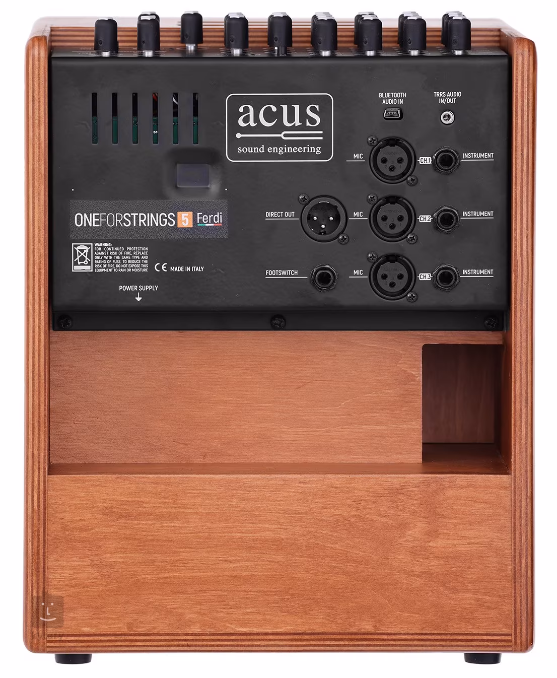 Acus One ForStrings 5 Ferdi Wood je trojkanálové akustické kombo zo série Ferdi s novým rozhraním/systémom Ferdi-UXLogic, výkonom 70 W a dvoma vstupmi (mikrofónovým a nástrojovým) na každom kanáli. Každý kanál má samostatný trojpásmový EQ, ovládanie hlasitosti, gain (-12 až +15 dB) a úroveň zvoleného vstavaného efektu. Prvý kanál navyše ponúka sekciu kompresora a trojpolohový prepínač, ktorý mení charakter EQ podľa zvoleného typu nástroja (Flat - lineárna odozva, rovnaký EQ ako kanály 2 a 3, Bass - pre nástroje s bohatými basmi, ako je akustická basa alebo kontrabas, Jazz - ideálny pre basové/jazzové gitary).