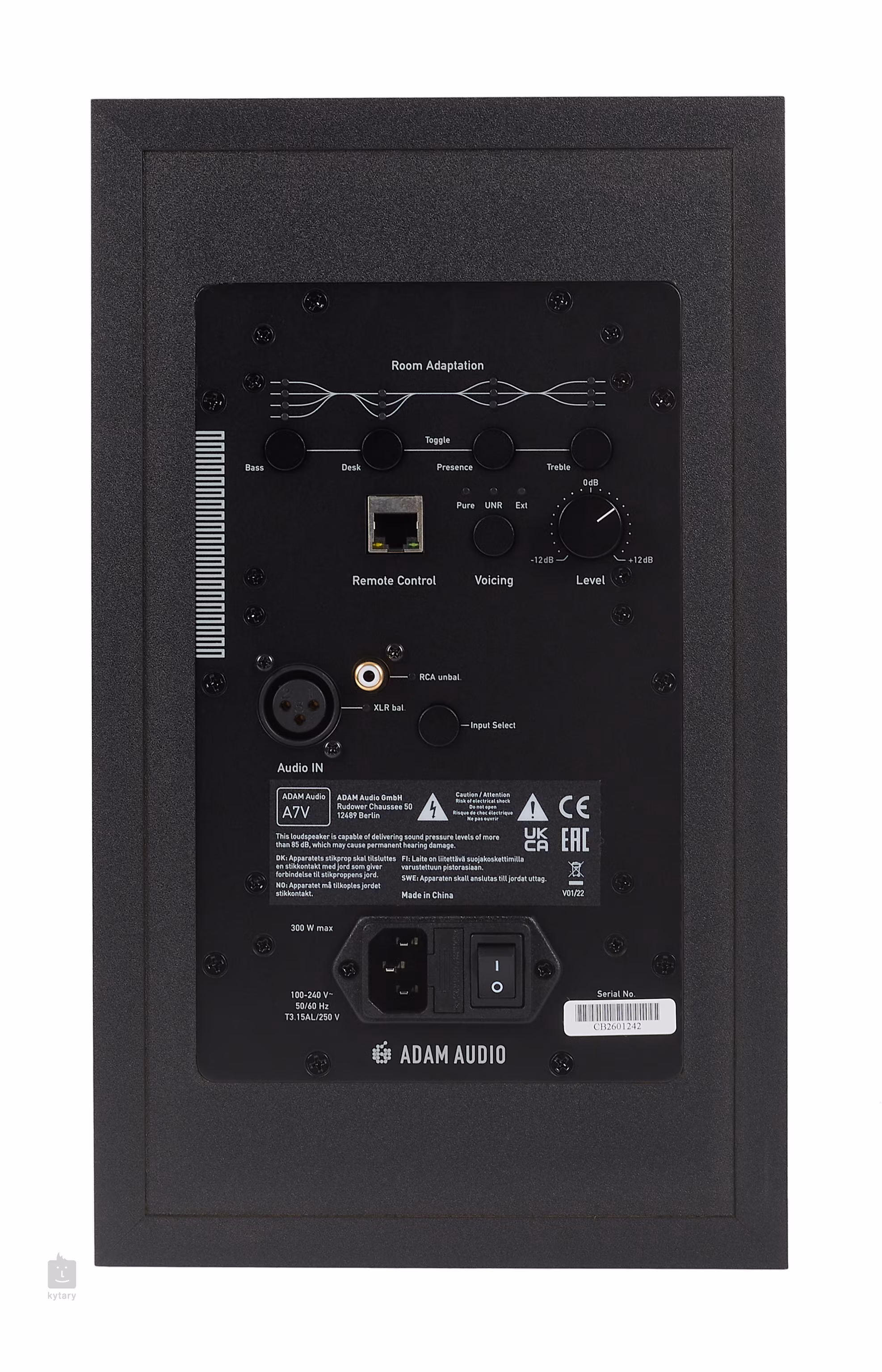 A7V je nový, modernejší nástupca najpredávanejšieho monitora Adam Audio A7X. Dvojpásmový štúdiový monitor je vybavený 7" MLM vláknovým wooferom a ručne vyrobeným výškovým reproduktorom X-ART, ktorý okrem širokého frekvenčného pásma ponúka maximálny výstupný výkon až 130 W. Zadný panel obsahuje konektory XLR a RCA, Ethernet RJ45, ovládanie hlasitosti, dva režimy prehrávania (Pure/UNR) a štyri ovládače EQ Room Adaptation. Okrem toho je súčasťou dodávky trojmesačná plná verzia softvéru Sonarworks pre akustiku miestnosti.
