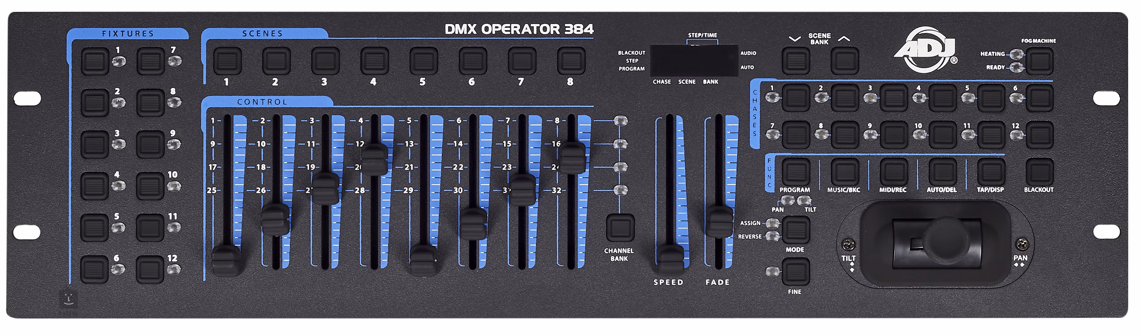 DMX Operator 384 od spoločnosti ADJ je všestranný 19" rackový ovládač DMX a MIDI, ktorý umožňuje ovládať až 12 svietidiel a pre každé svietidlo až 32 kanálov. Celkovo dokáže obslúžiť až 384 kanálov. Okrem toho umožňuje naprogramovať až 240 scén a vytvárať z nich sekvencie alebo chases. K dispozícii je 8 pamäťových bánk pre scény (každá pojme 30 scén) a 12 sekvencií (každá sekvencia môže obsahovať až 240 krokov).