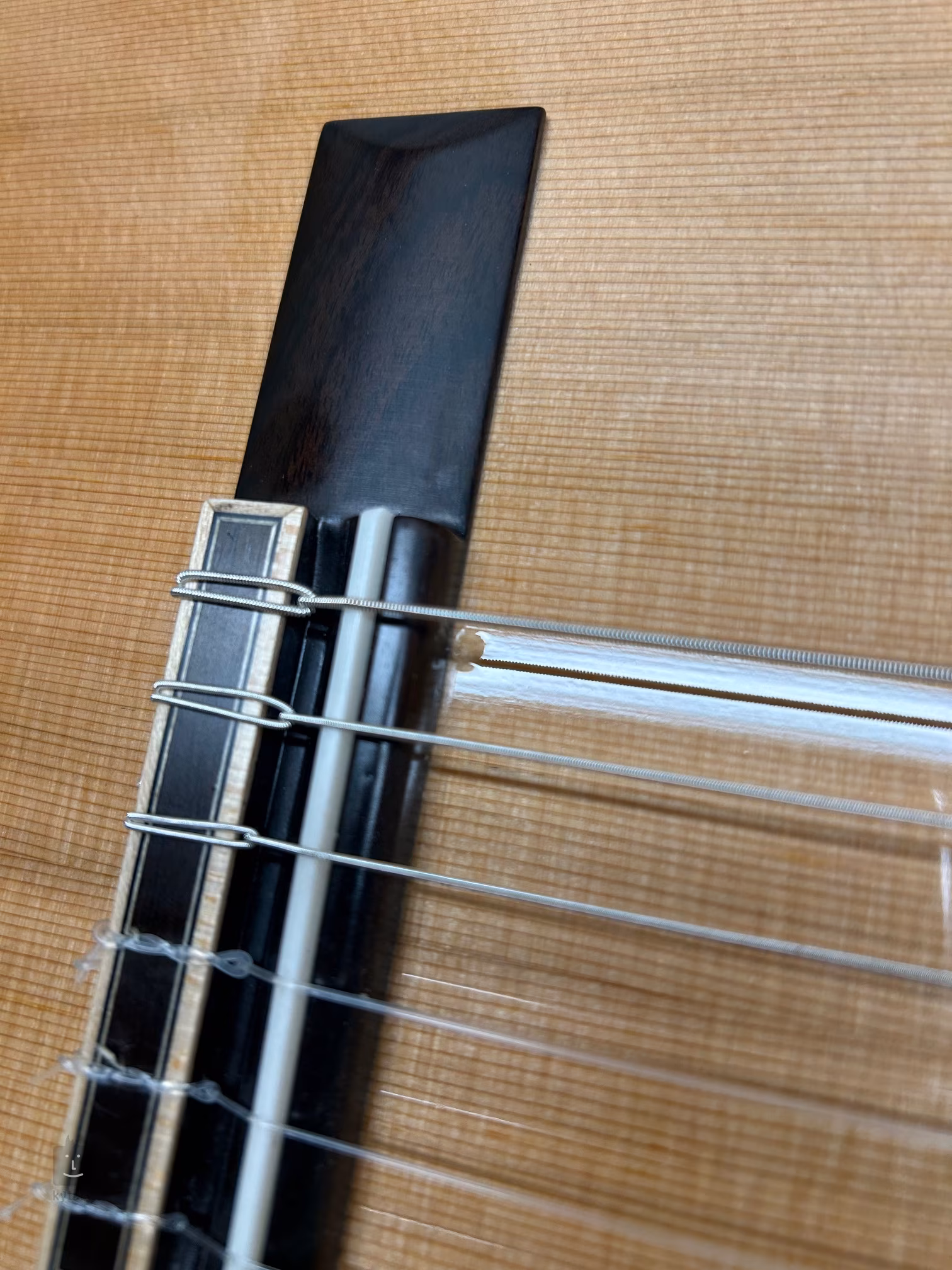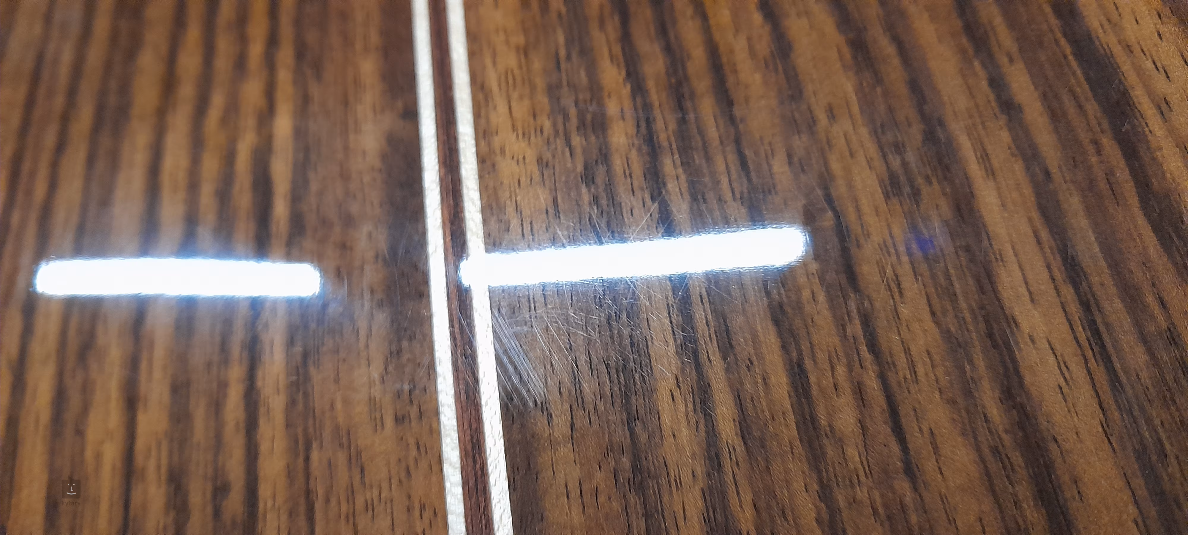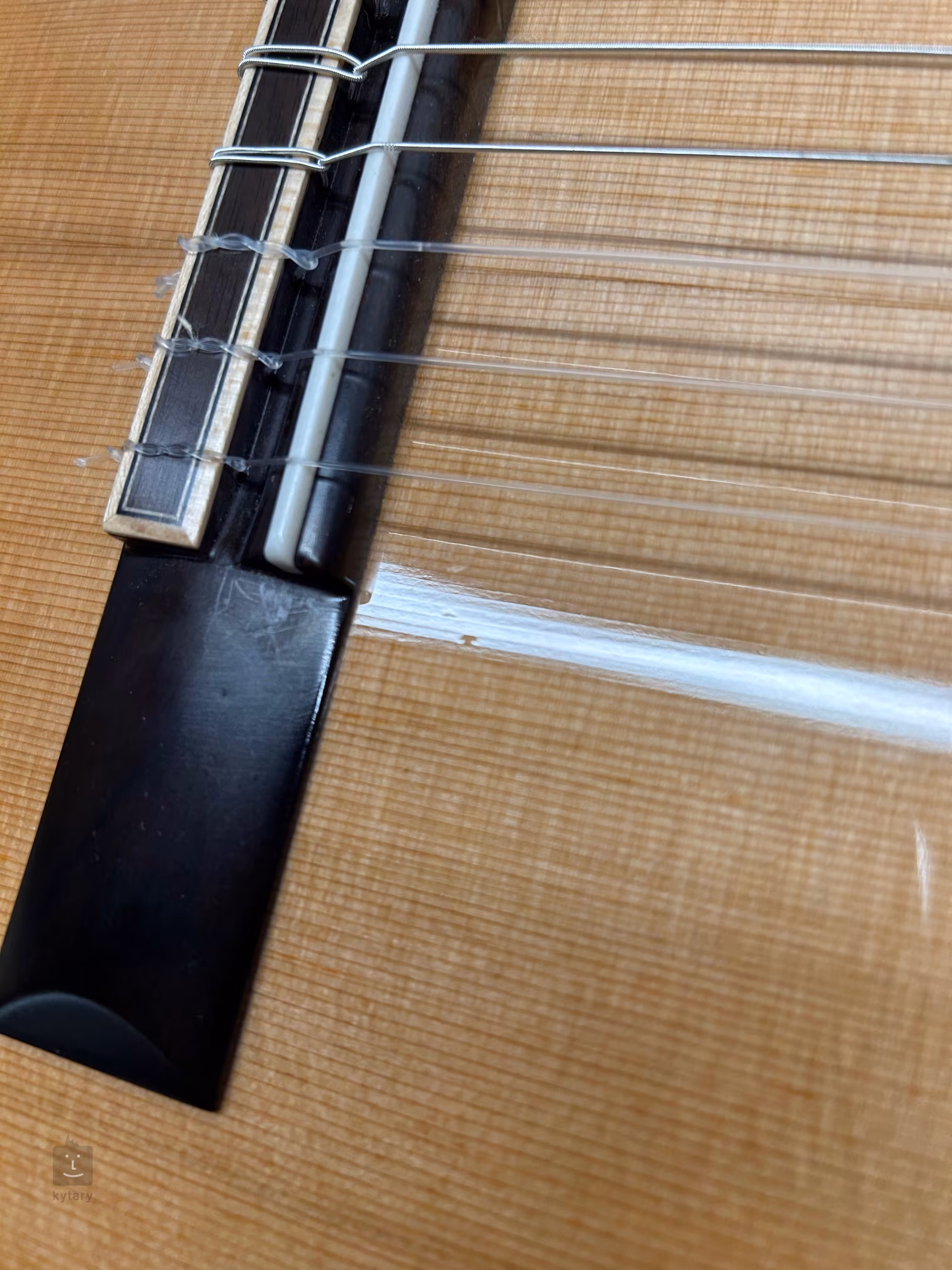 Dve odreniny v laku pred kobylkou pod strunami, škrabance (pozri foto). Inak je nástroj v dobrom stave a plne funkčný.