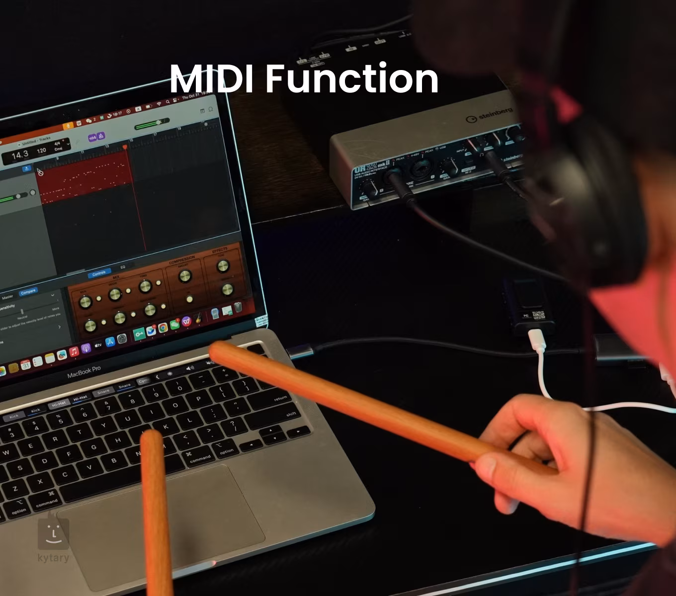 Pocket Drum 2 MAX funguje aj ako MIDI kontrolér, vďaka čomu ho možno ľahko používať pri hudobnej produkcii a nahrávaní v DAW. Súčasťou balenia sú elektronické paličky, pedále a adaptér so zabudovanými batériami, ktoré umožňujú až 16-18 hodín nepretržitého hrania. Nabíjanie prebieha cez USB a trvá približne 1 - 2 hodiny.