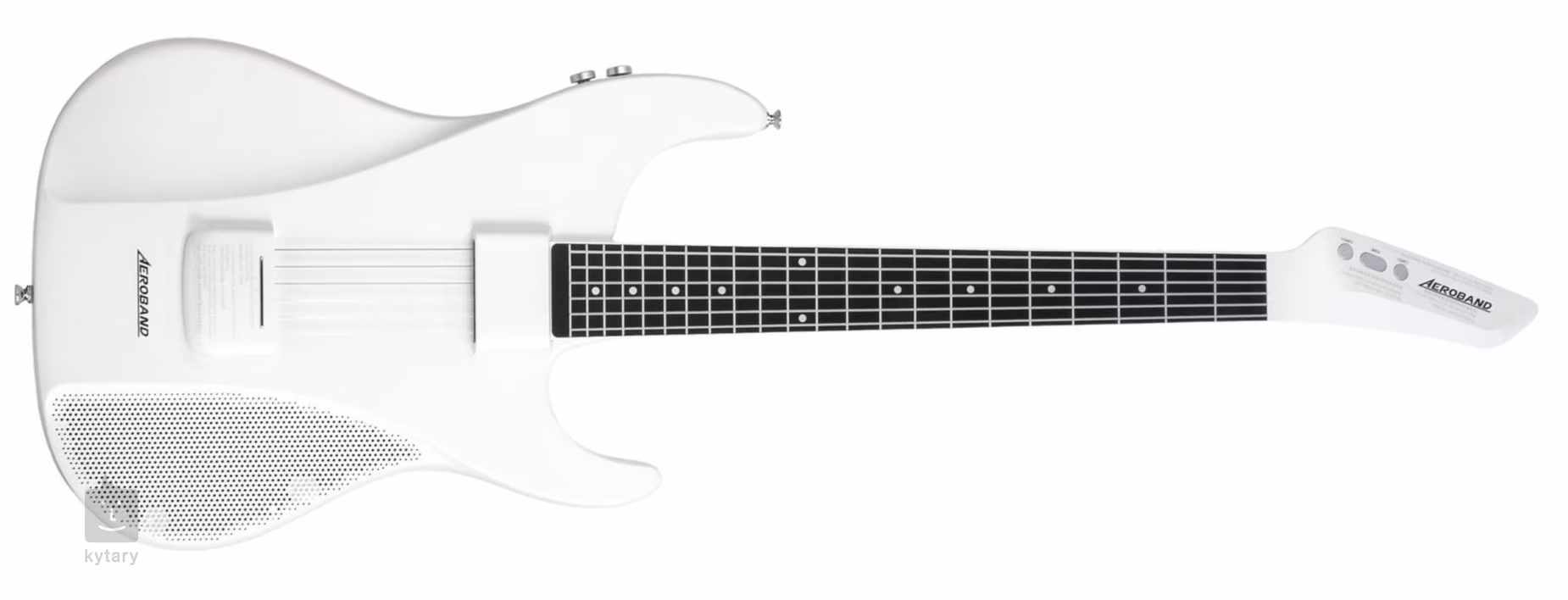 Aeroband Smart Guitar White je viac než len digitálna gitara s originálnym dizajnom - ponúka deväť zabudovaných digitálnych/MIDI zvukov (od gitary cez banjo až po klavír), zabudovaný reproduktor (pripojenie cez Bluetooth), bicie slučky a vstup pre mikrofón.