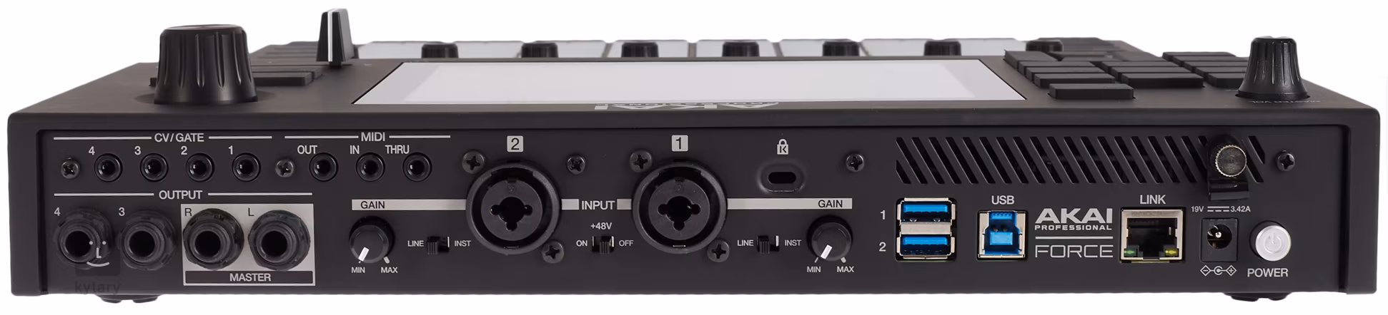 Ovládanie a pripojenie Ovládanie je veľmi intuitívne vďaka sedempalcovému dotykovému displeju, farebne označeným podložkám a funkčným tlačidlám, ktoré umožňujú rýchly prístup ku všetkým dôležitým funkciám. Na zadnom paneli je dvojica kombinovaných vstupov XLR/TRS na priame vzorkovanie z mikrofónu, nástrojov alebo linky, 3,5 mm konektory pre adaptéry MIDI, USB pre počítač a periférie, štyri zvukové výstupy a dokonca aj konektory CV. Akai Fire funguje aj s modulárnymi a vintage syntetizátormi.