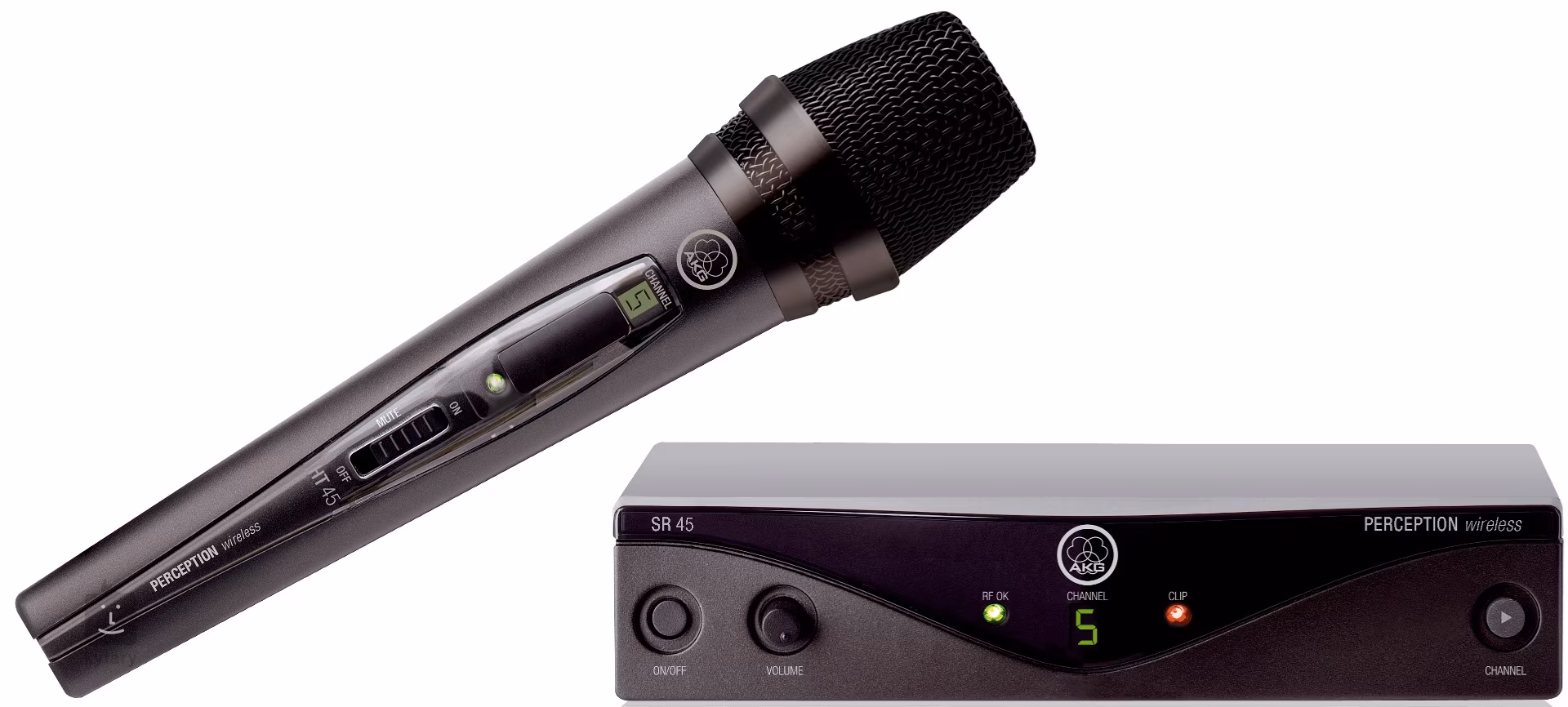 Súčasťou setu AKG Perception Wireless Vocal Set je prijímač AKG SR45 a mikrofón do ruky AKG HT45. Prijímač má na svojom šasi minimum ovládacích prvkov, napriek tomu nie je nastavovanie parametrov nijako ochudobnené. Na ovládanie slúži potenciometer Volume, tlačidlo Channel na prepínanie kanálov, LED displej zobrazujúci zvolený kanál, LED indikátory signálu a clippingu, vypínač a trimer na nastavenie squelchu. Výstupy sú osadené konektormi XLR a 1" Jack. Mikrofón obsahuje dynamickú mikrofónovú vložku s kardioidnou smerovou charakteristikou. Vyznačuje sa vysokou odolnosťou proti mechanickým ruchom aj spätnej väzbe. Na tele mikrofónu je displej zobrazujúci zvolený kanál a tlačidlo na prepínanie kanálov, prepínač citlivosti mikrofónu, LED indikátor stavu batérie a vypínač. AKG HT45 je napájaný jednou AA batériou, s ktorou dosahuje životnosť až 10 hodín.