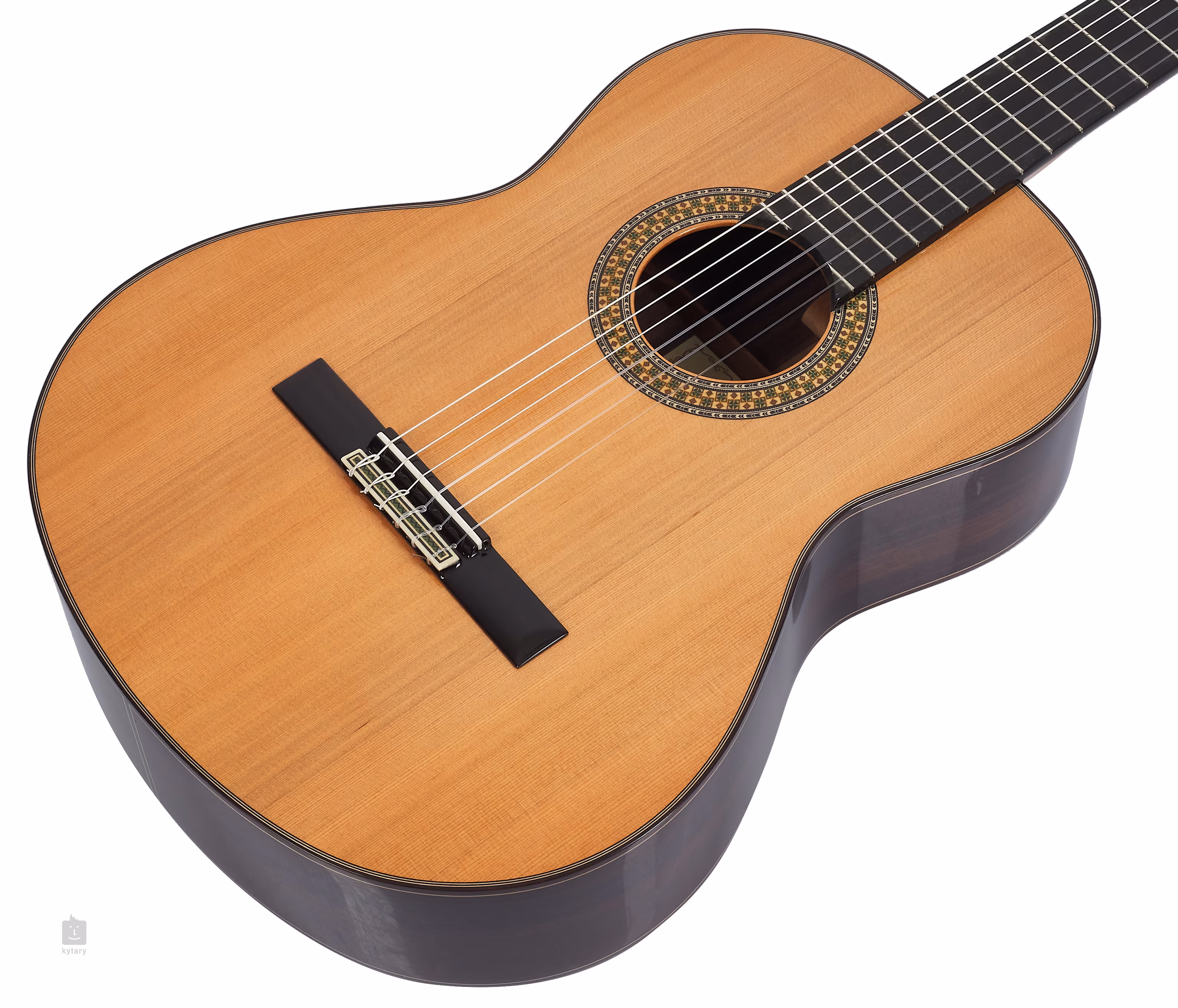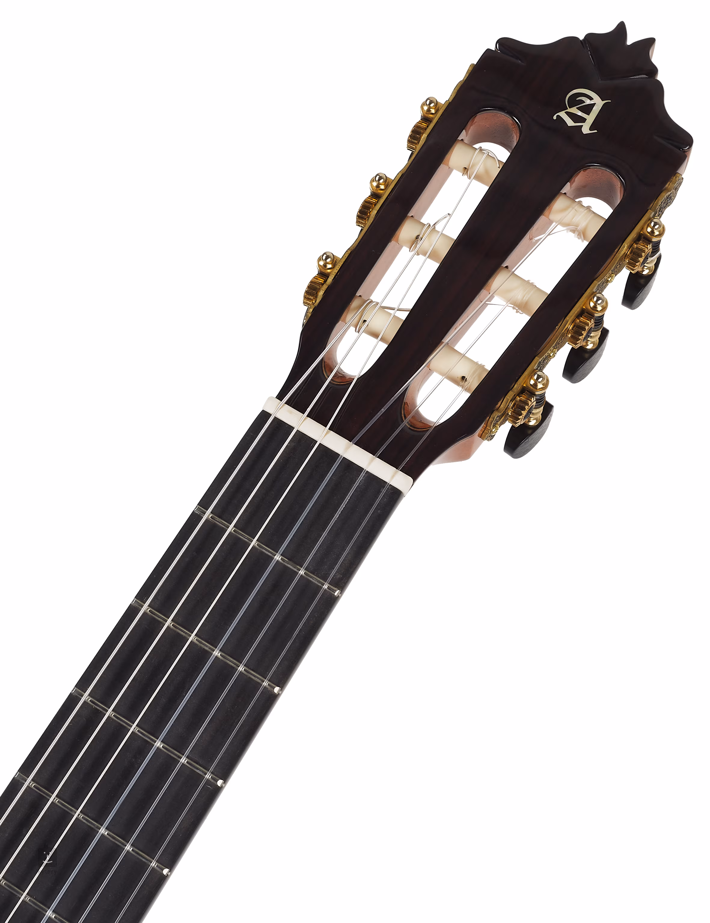 Cédrový krk s ebenovou výstuhou je prilepený k ebenovému hmatníku osadenému devätnástimi pražcami. Hmatník je tiež vyrobený z ebenu, kostené sedlo a nultý pražec poskytujú strunám optimálnu vibráciu. Stabilitu ladenia zaručujú precízne pozlátené mechaniky s klasickými kolíkmi. Dizajn gitary vhodne dopĺňa obojstranná väzba a ozdobná rozeta.