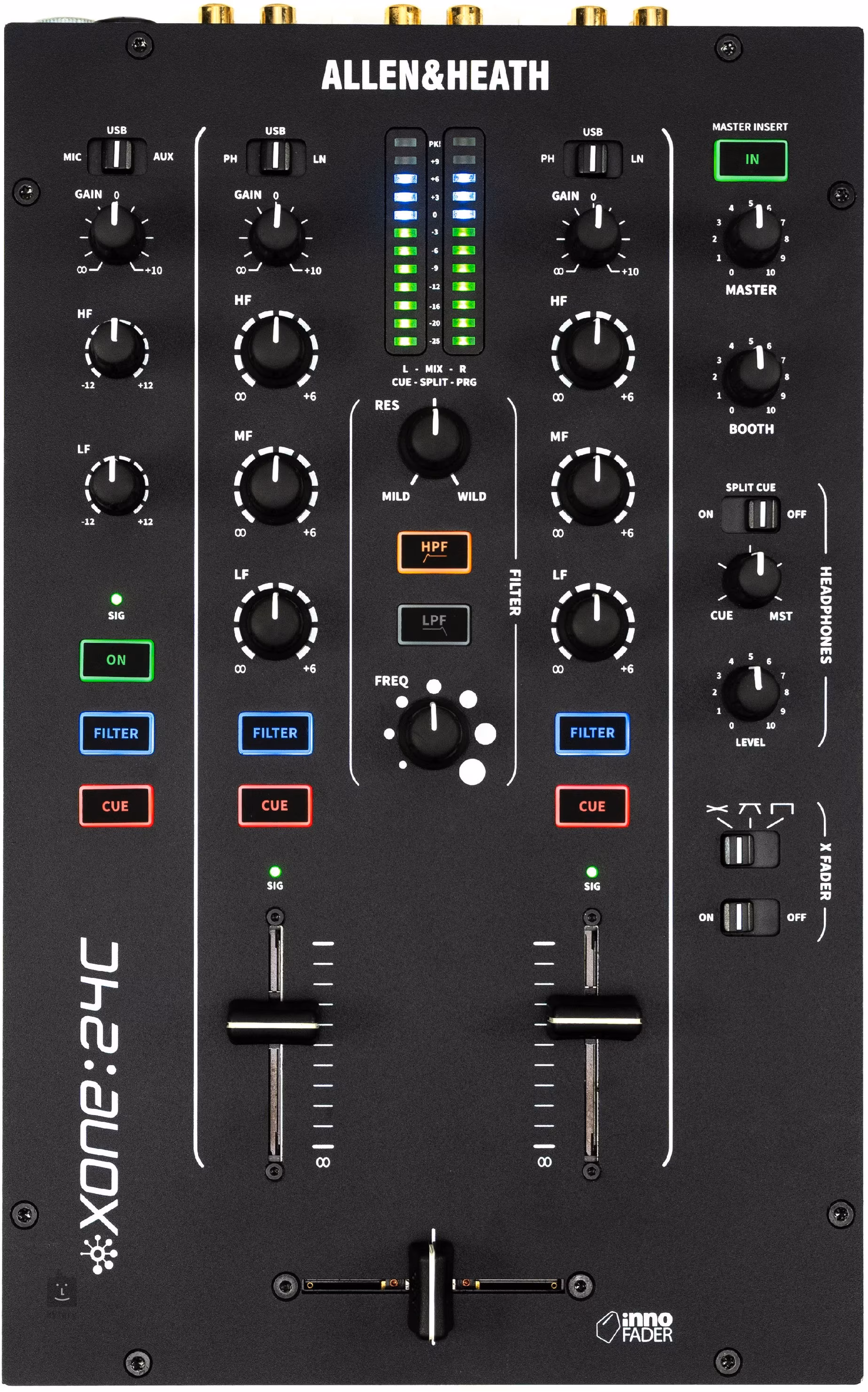 Pre maximálny výkon je Xone:24C vybavený vysokokvalitným krížovým faderom Mini innoFADER s plynulým chodom a vysokou odolnosťou, podsvietenými prepínačmi a prehľadnými RGB LED meradlami. K dispozícii je tiež Master Insert / FX loop (Send/Return) pre jednoduché pripojenie externých efektov alebo dynamických procesorov, čo rozširuje kreatívne možnosti pre živé vystúpenia a klubové inštalácie.