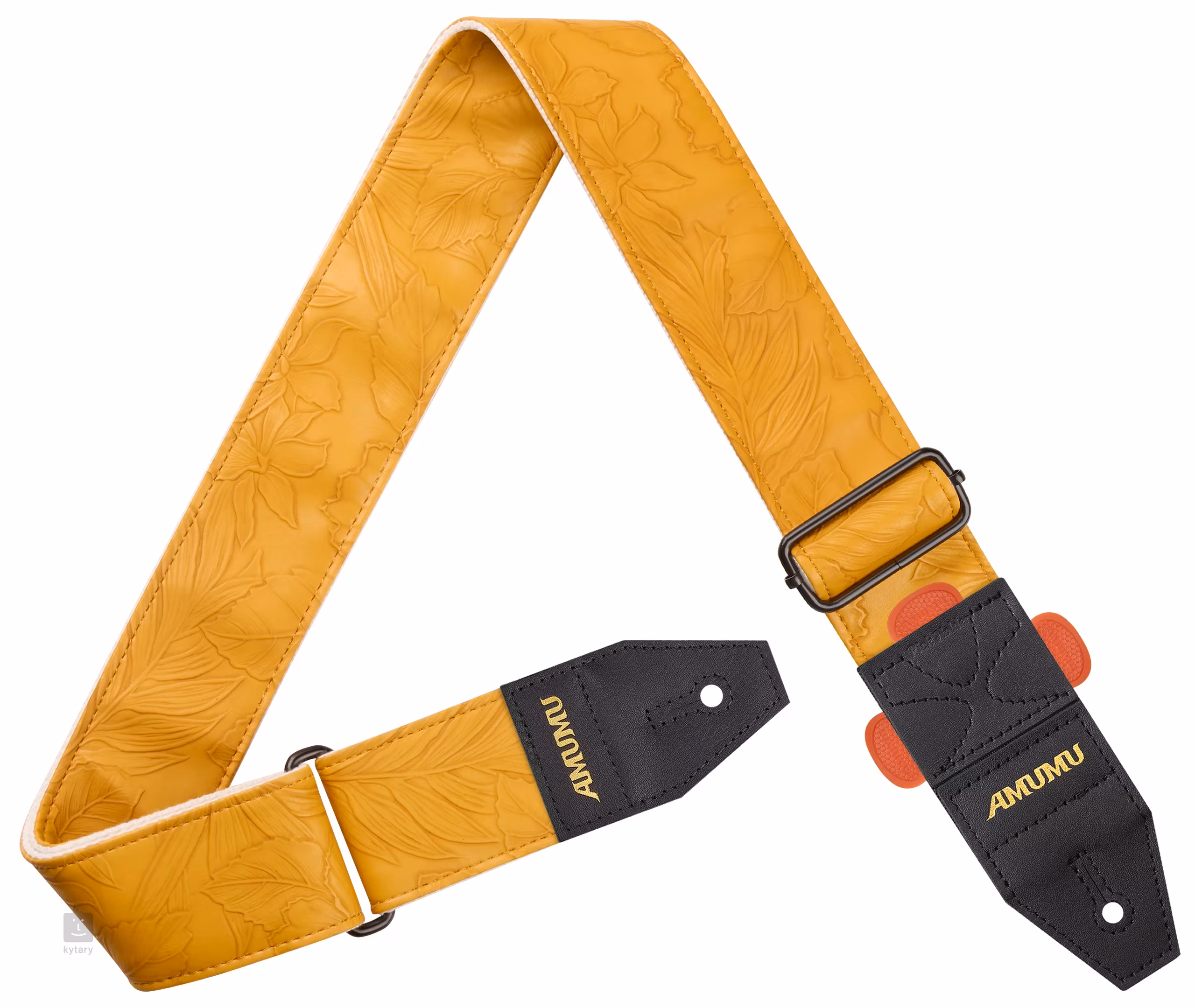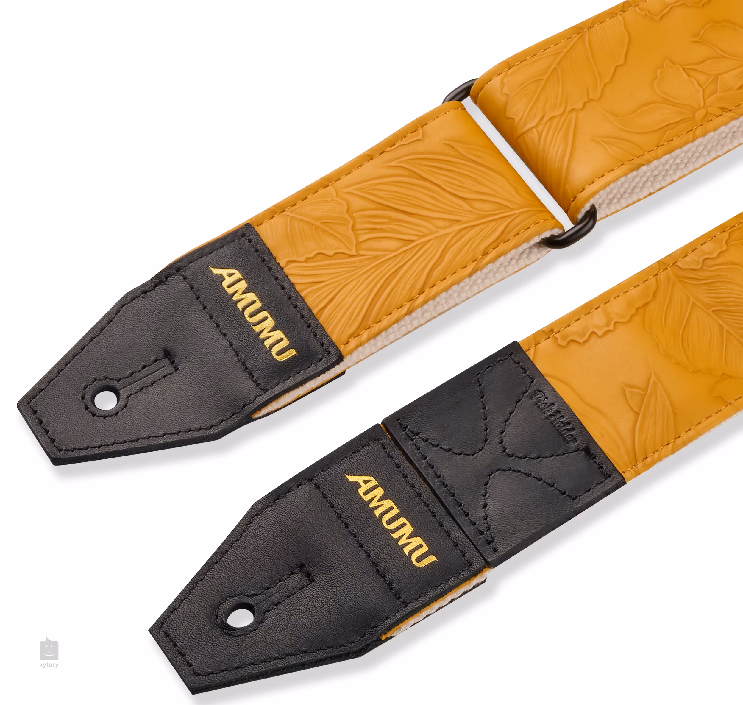 Gitarové popruhy AMUMU sú známe svojou odolnosťou, spoľahlivosťou a kvalitným spracovaním. Vďaka širokej škále modelov a farieb si každý nájde to svoje. Popruh Embossed Leaf Yellow je vyrobený zo žltého koženkového materiálu zdobeného lístkami. Koženka je podšitá pružným bavlneným materiálom, ktorý zaisťuje flexibilitu a celodenné pohodlie. Vysoko kvalitné koncovky z pravej kože zabezpečujú, že popruh je bezpečne pripevnený k nástroju a má dlhú životnosť. Pre väčšiu praktickosť je jedna z koncoviek vybavená tromi držiakmi na trsátka, ktoré sa vám zídu, ak vám trsátko náhodou vypadne uprostred koncertu alebo cvičenia.