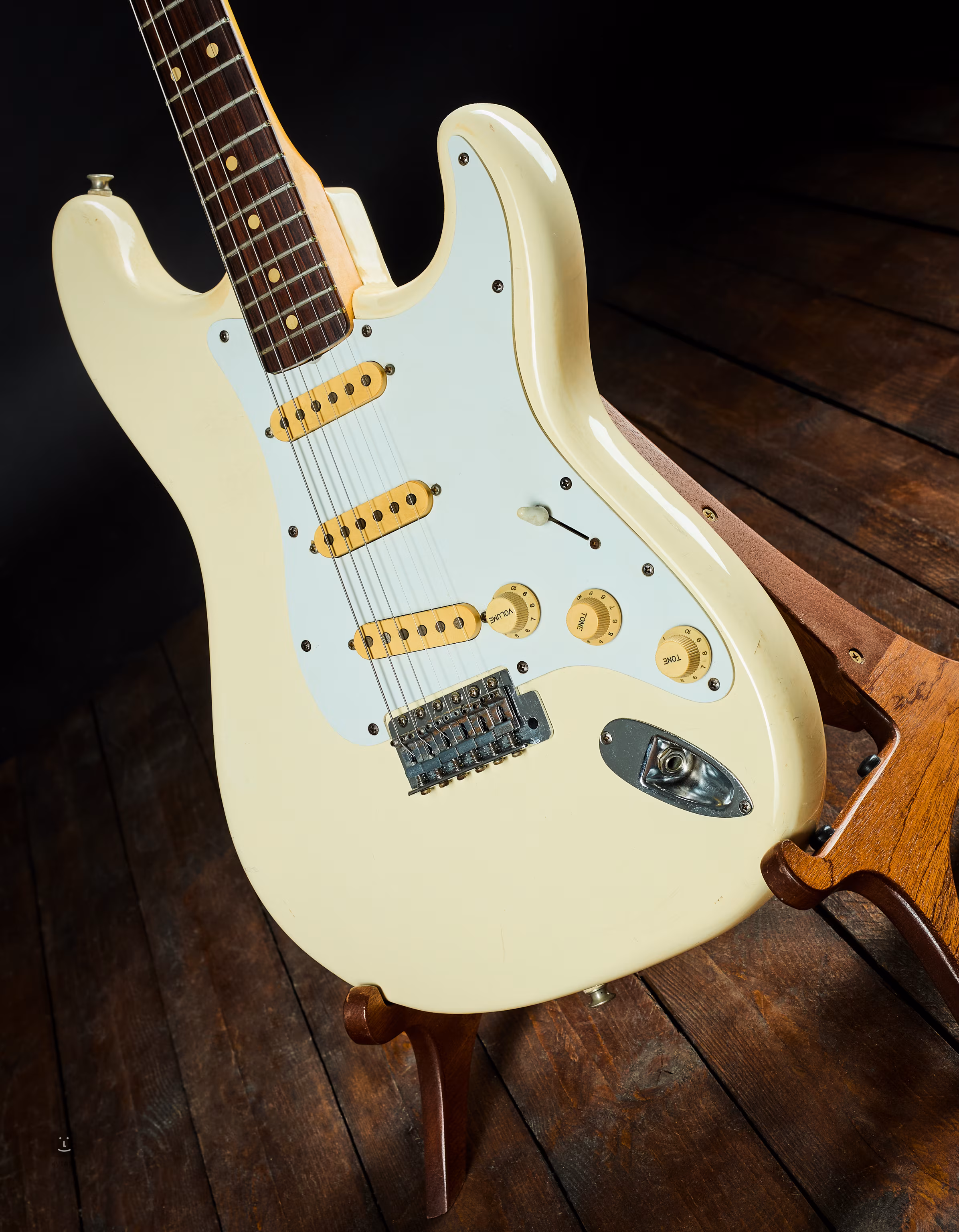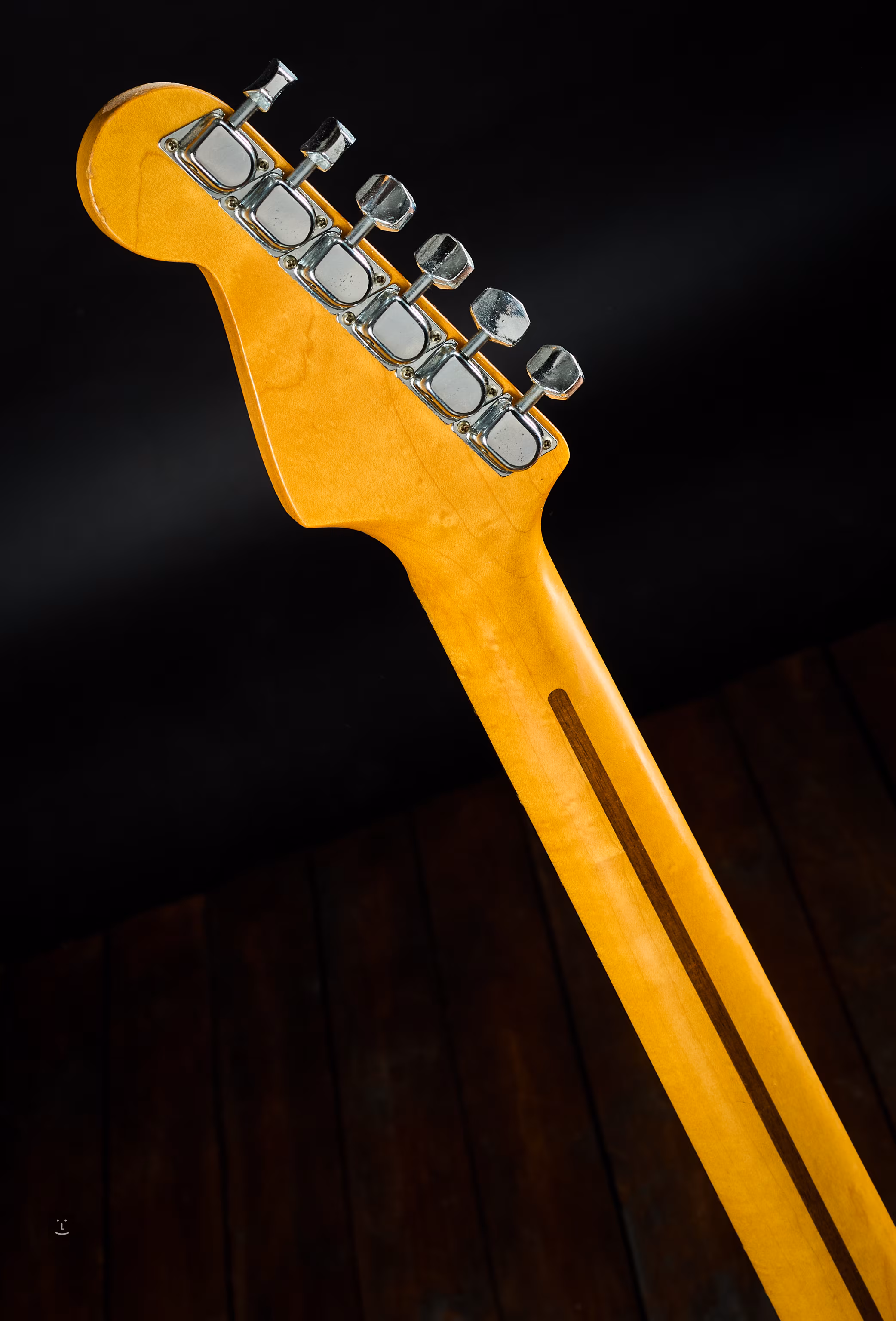 Na hardvéri je mierna patina (drobná korózia), zatiaľ čo na laku - prevažne na tele - sa prejavuje zub času v podobe zmeny farby a drobných odrenín. Všetko je pôvodné a plne funkčné (ramienko, elektronika).