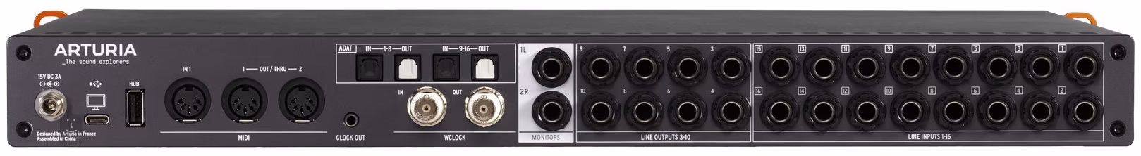 2x Jack 6.3 mm (monitors), 10x Jack 6.3 mm (line), 2x ADAT optical Toslink, Jack 6.3 a 3.5 mm (phones), 1x Jack 3.5 mm (clock), MIDI 5-pin DIN, WC BNC, USB-C