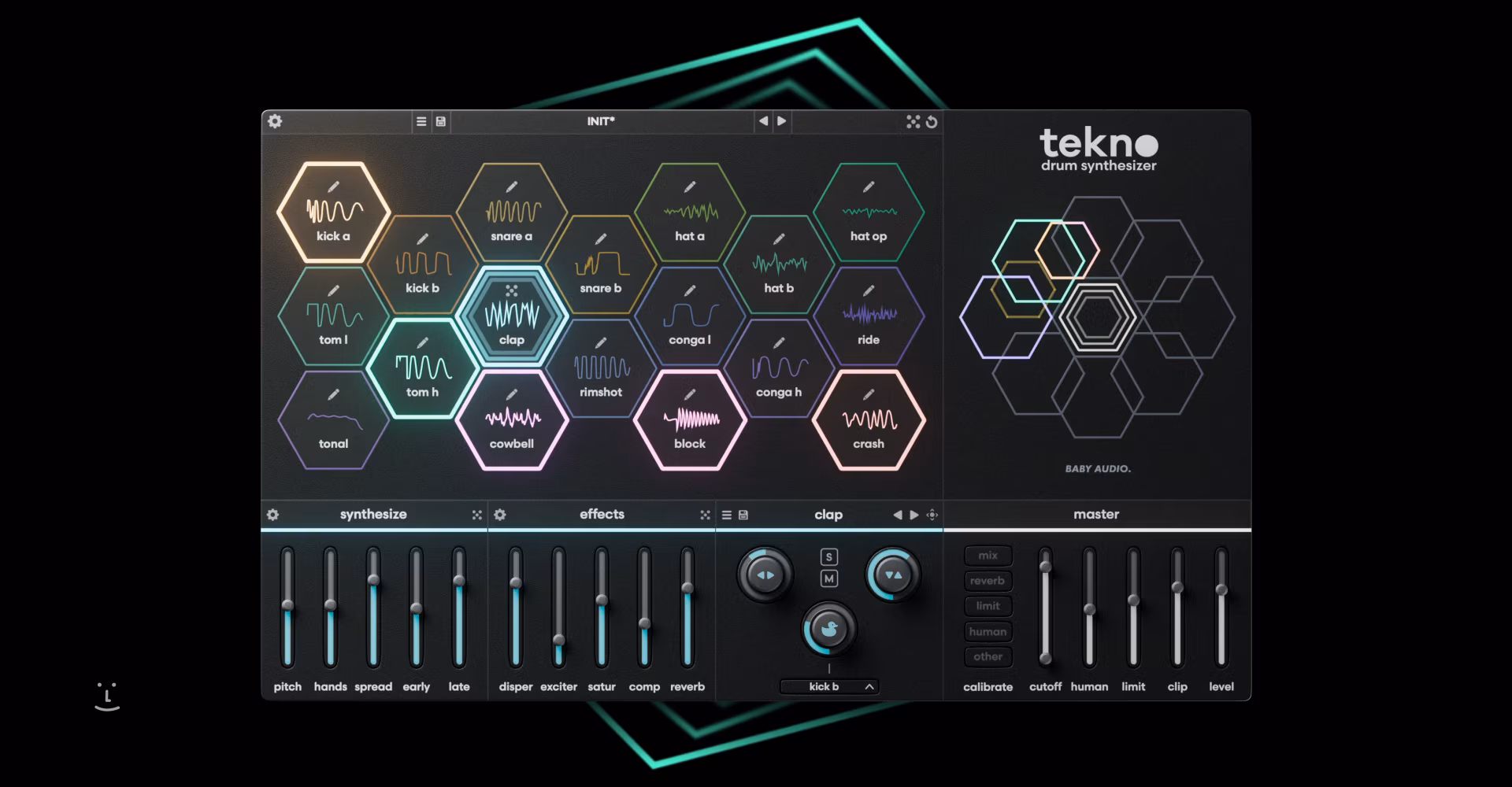 Baby Audio Tekno je moderný plugin pre syntetizátor bicích nástrojov, ktorý slúži na vytváranie tvrdých, hlbokých a živých elektronických bicích – úplne bez použitia vzoriek. Ak chcete vytvoriť svoje vlastné kopáky, snare, hi-haty a perkusné prvky od nuly a mať plnú kontrolu nad ich charakterom, Tekno vám ponúka výkonný nástroj inšpirovaný legendárnymi bicími automatmi z 80. a 90. rokov, ale s funkciami 21. storočia.