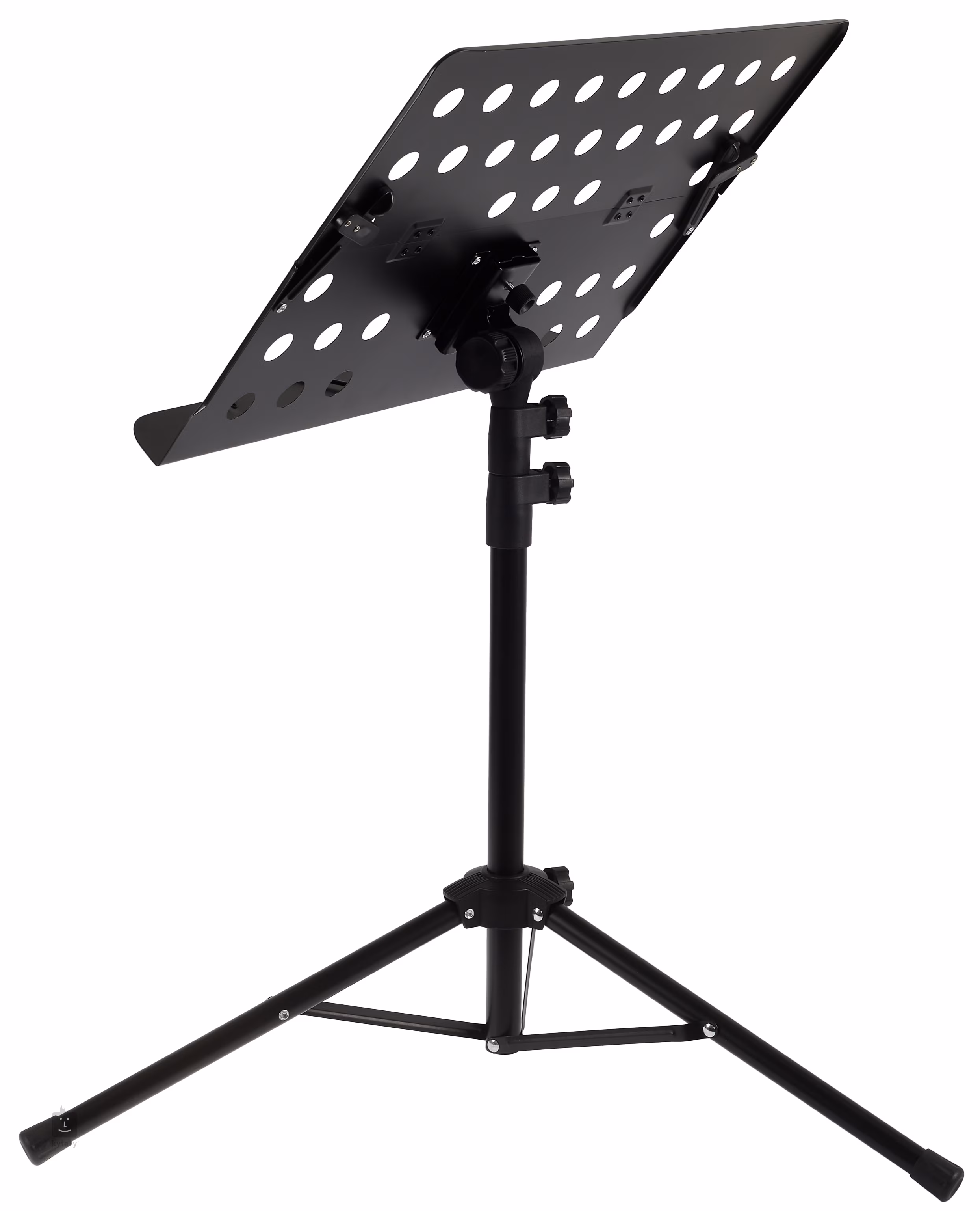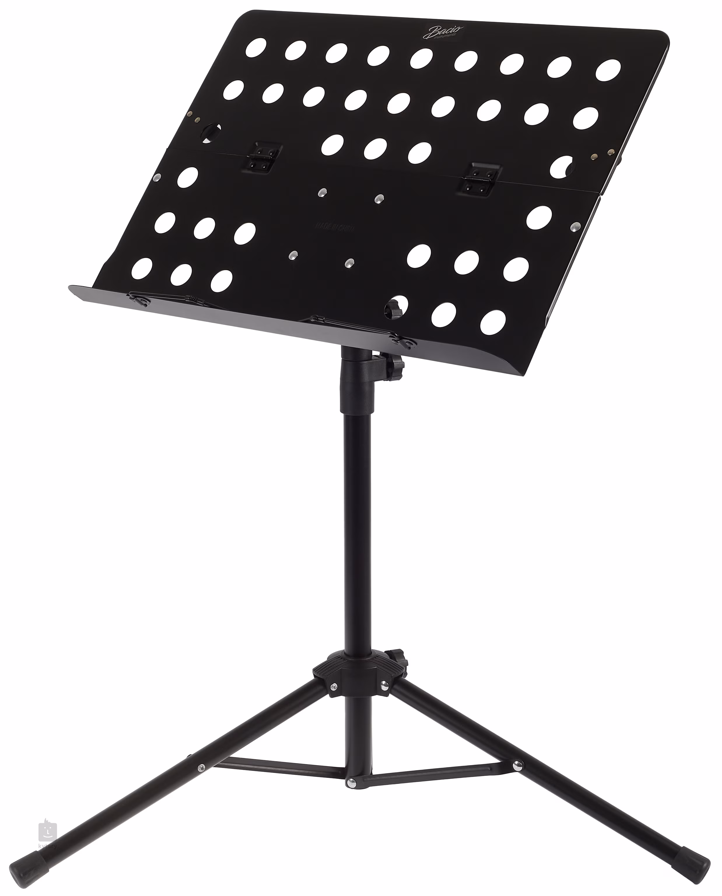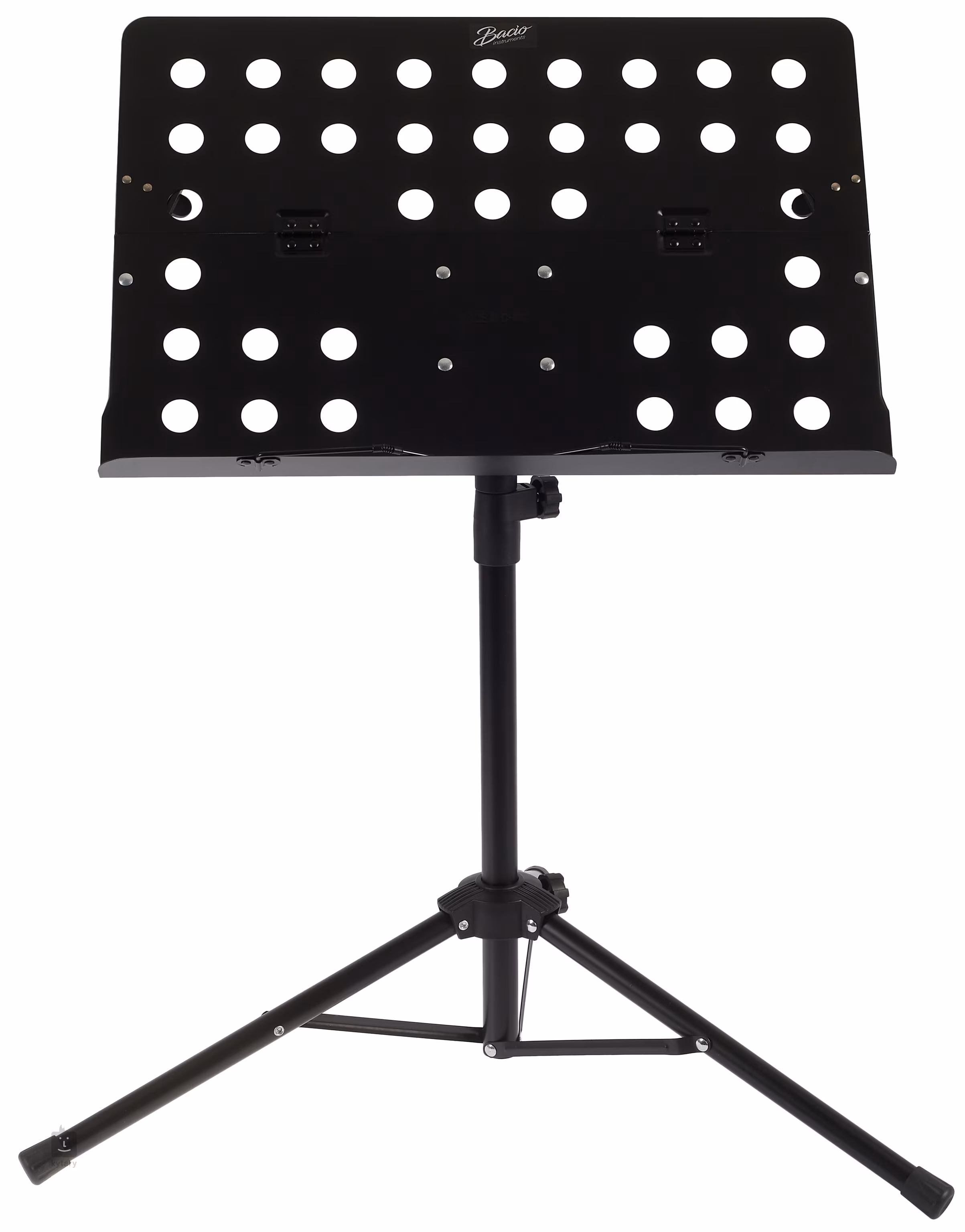Bacio MS-16 je kovový notový stojan s robustnou trojnožkovou základňou, nastaviteľnou výškou (750 - 1500 mm) a perforovaným notovým stojanom s rozmermi 50 x 35 cm, ktorý sa dá odpojiť a zložiť.