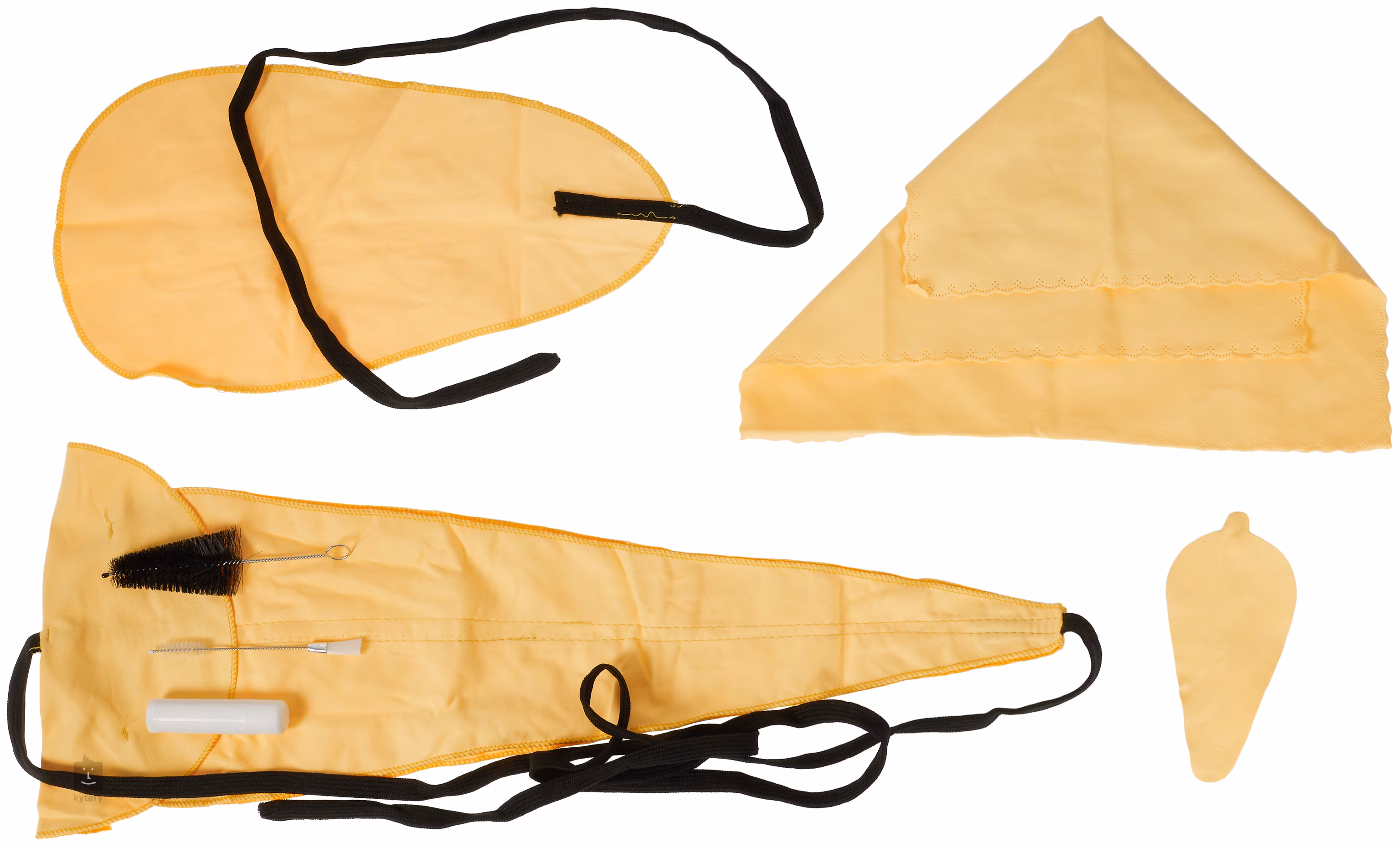 Súprava Bacio Saxophone Care Kit obsahuje utierku, handričku, korkové mazivo a kefku na čistenie mechaniky (ventily, pružiny).