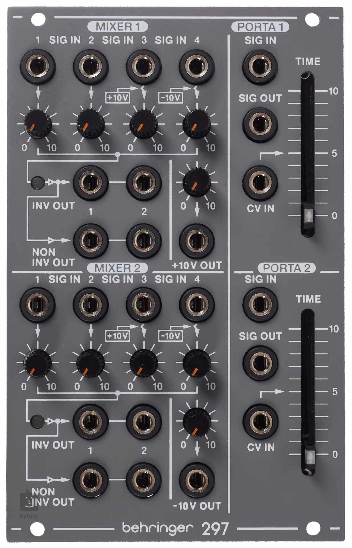 Modul 297 Dual Portamento/CV Utilities obsahuje dva nezávislé mixéry pre CV signály so štyrmi vstupmi a atenuátormi, dva portamento kontroléry s CV moduláciou, dva generátory konštantného napätia (+/- 10 V) a CV mixéry s normálnym a invertovaným výstupom.