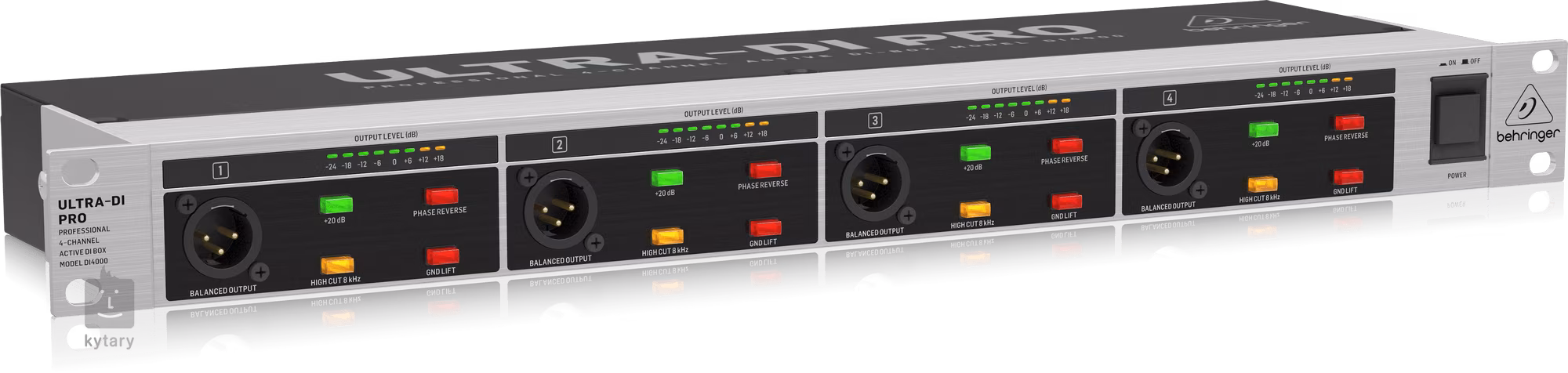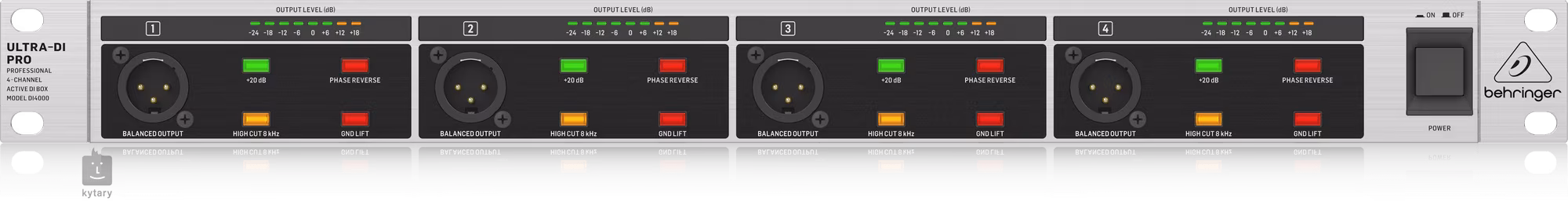 BEHRINGER DI4000 V2 je štvorkanálový aktívny DI box vhodný na štúdiové a koncertné použitie s ultra-lineárnou odozvou vďaka použitiu transformátorov Behringer OT-1, vstupným útlmom/zatlmením až 40 dB, ako aj 20 dB predzosilňovačom pre slabé signály, prepínačom fázy, high-cut filtrom (8 kHz), osemsegmentovým LED meračom a pozlátenými 6,3 mm konektormi TRS a XLR jack.