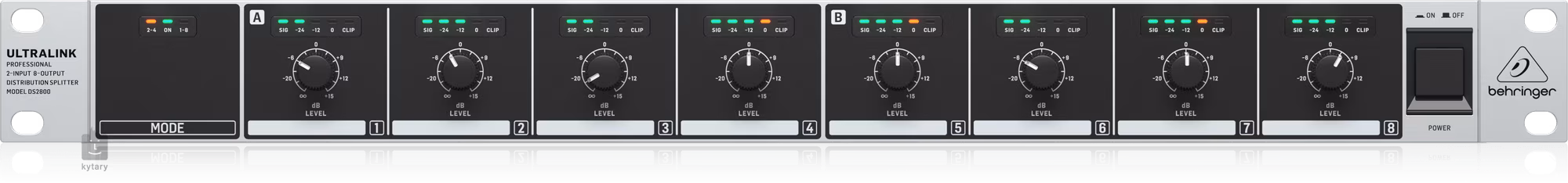 Behringer DS2800 je profesionálny distribučný rozdeľovač v prevedení 1U rackovej jednotky pre 2 vstupné a 8 výstupných kanálov.