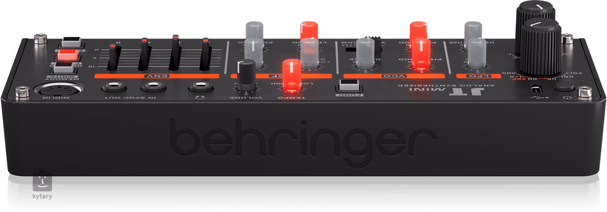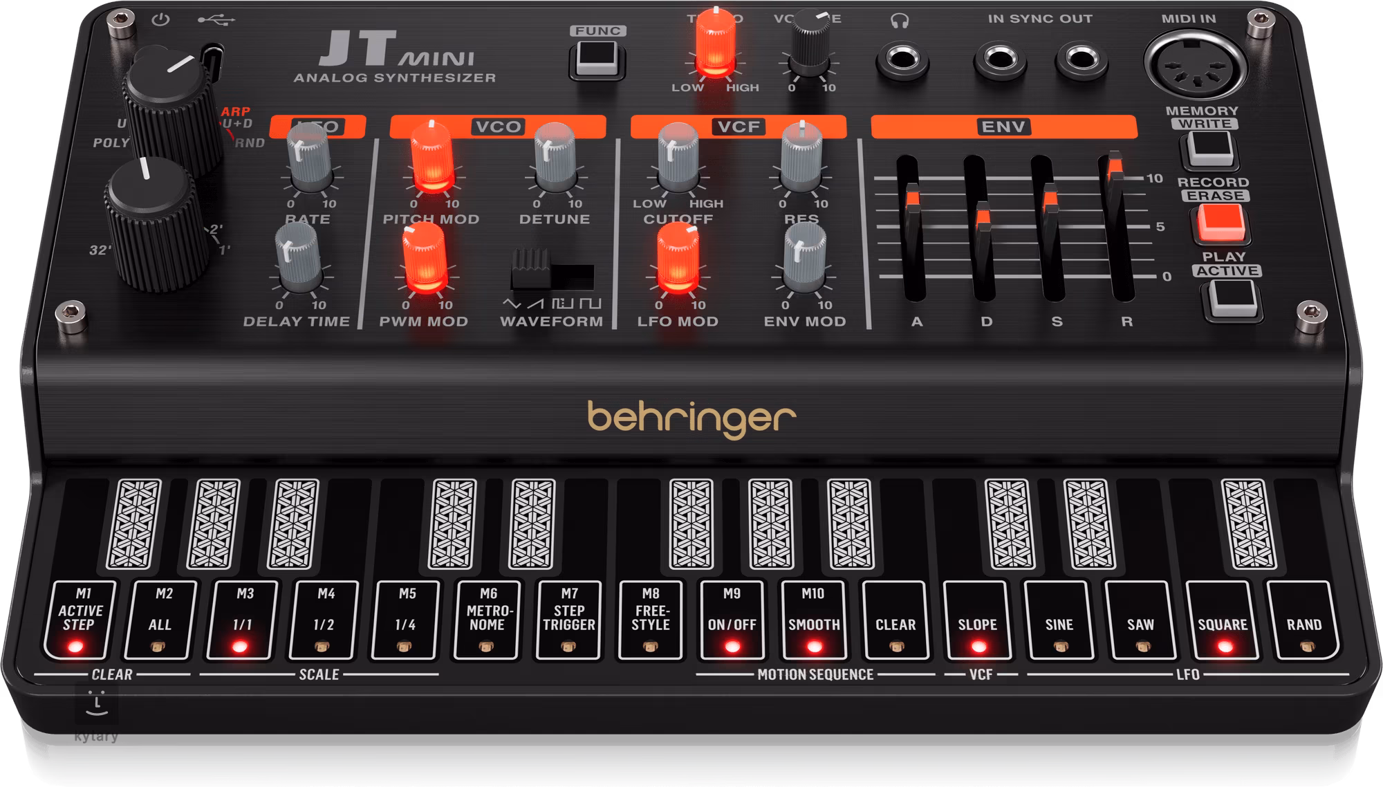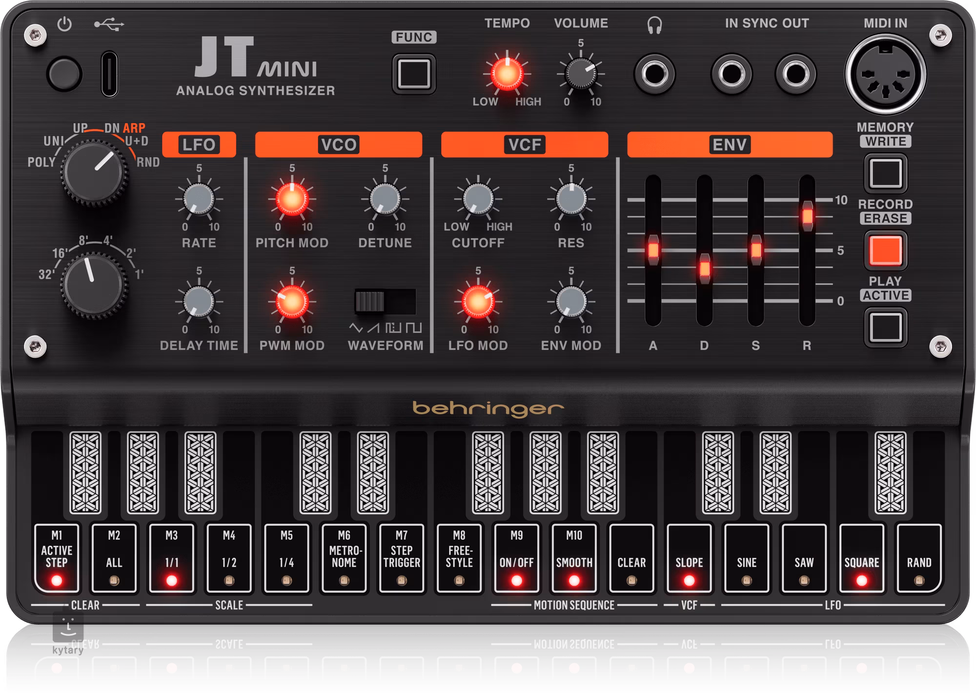 Sekcia VCF je vybavená ovládacími prvkami cutoff a resonance. Zároveň máte možnosť zmiešať moduláciu LFO a Envelope, ktorú môžete ovládať pomocou špeciálnych posuvníkov ADSR. Vďaka 27 dotykovým klávesom ponúka JT MINI na rozdiel od svojej malej veľkosti veľmi slušnú hrateľnosť. Vďaka klasickému MIDI konektoru môžete pripojiť aj klávesnicu v plnej veľkosti, napríklad pre živé vystúpenia alebo nahrávanie. V kombinácii s ľahko programovateľným 16-krokovým sekvencerom získate univerzálny, výkonný a kompaktný nástroj na tvarovanie zvuku, ktorý si ľahko nájde miesto vo vašej zostave.