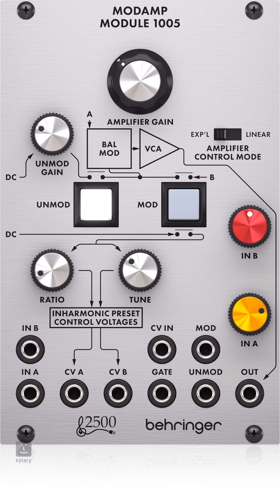 Behringer 1005 MODAMP MODULE je vybavený diskrétnym vyváženým modulátorom a VCA. Modulátor prijíma 2 vstupné signály (DC až 20 kHz) a produkuje výstup, ktorý je násobkom týchto dvoch signálov. Vytvára komplexné priebehy s neharmonickými alikvótami. Modulácia sa aktivuje podsvietenými tlačidlami (Mod a Unmod). V režime Unmod prechádza signál na vstupe A na výstup bez modulácie a úroveň sa nastavuje pomocou ovládača Unmod Gain. Moduláciu možno zapínať a vypínať signálmi trigger alebo gate. VCA prijíma výstup z modulátora a nastavuje úroveň výstupného signálu podľa súčtu regulátora Gain a externého riadiaceho napätia. K dispozícii sú 2 externé riadiace signály VCA s nastaviteľným útlmom. Režim VCA možno prepínať medzi exponenciálnym a lineárnym.