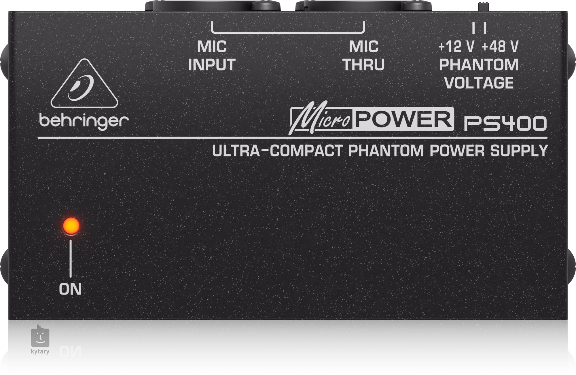 Behringer PS400 je externý fantómový napájací zdroj pre kondenzátorové mikrofóny. Táto krabička kompaktných rozmerov je vybavená vlastným 12 DC napájacím zdrojom (je súčasťou balenia) a poskytuje 12 alebo 48 V napájanie. Hodí sa, keď váš mix alebo predzosilňovač neposkytuje toto napájanie. Stačí pripojiť kondenzátorový mikrofón k vstupu Mic Input XLR (F, samica) a poslať signál z Mic Thru XLR (M, samec) ďalej.