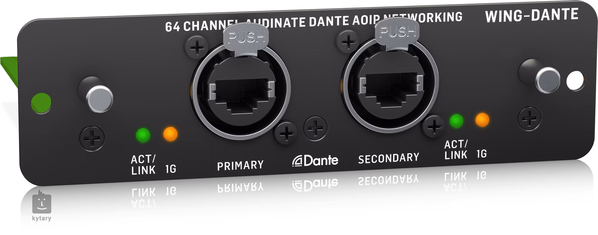 Behringer WING-DANTE je rozšiřující karta pro digitální mixážní konzole Behringer WING, která nabízí 64 x 64 I/O kanálů pro digitální audio sítě Audinate Dante AoIP Networking. 64 vstupních a 64 výstupních kanálů s frekvencí 48 kHz přináší do systému WING ještě více možností, protože je připraveno pro integraci do IP sítí s podporou Dante. Dante je vlastní řešení AoIP od společnosti Audinate, které pracuje také v souladu se standardem AES67 pro lepší interoperabilitu. Využívá buď standardní 100 Mbit/s, nebo gigabitovou síťovou infrastrukturu s QoS založenou na DSCP, s podporou smíšených vzorkovacích a přenosových rychlostí koexistujících ve stejné síti. Karta WING-DANTE využívá 24bitový přenos signálu s přesnou synchronizací vzorků a nízkou latencí, což zajišťuje nejvyšší integritu zvuku. Její sekundární port umožňuje nastavit bezproblémový, redundantní přístup k síti.