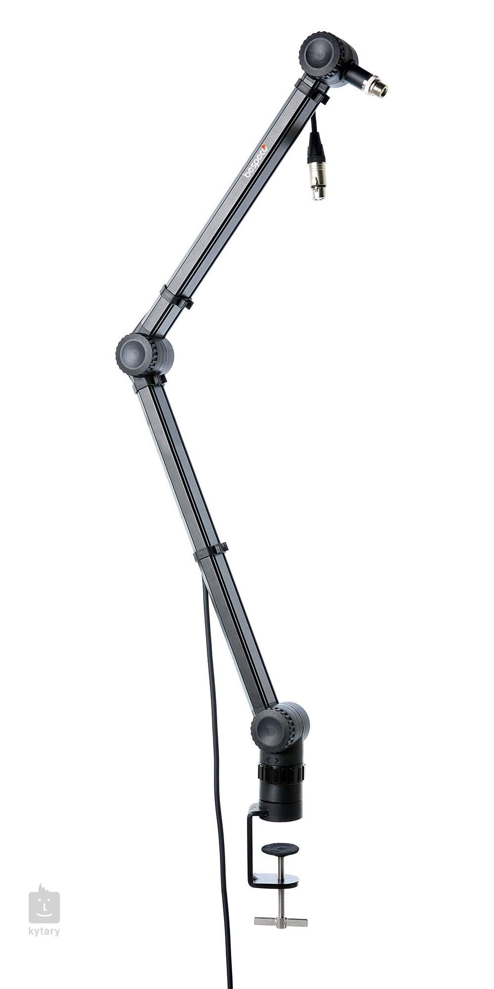 Robustný mikrofónový stojan vhodný pre domáce nahrávacie štúdiá, vysielanie, podcast alebo študentské rádio. Stojan je možné pripevniť pomocou závitovej skrutky na stôl alebo dosku stola s výškou do 60 mm. Stojan je vyrobený z kvalitného hliníka a jeho nastaviteľné rameno je vybavené aj svorkami na dokonalé vedenie káblov. Súčasťou balenia je redukcia so závitom a 4 m mikrofónový kábel.