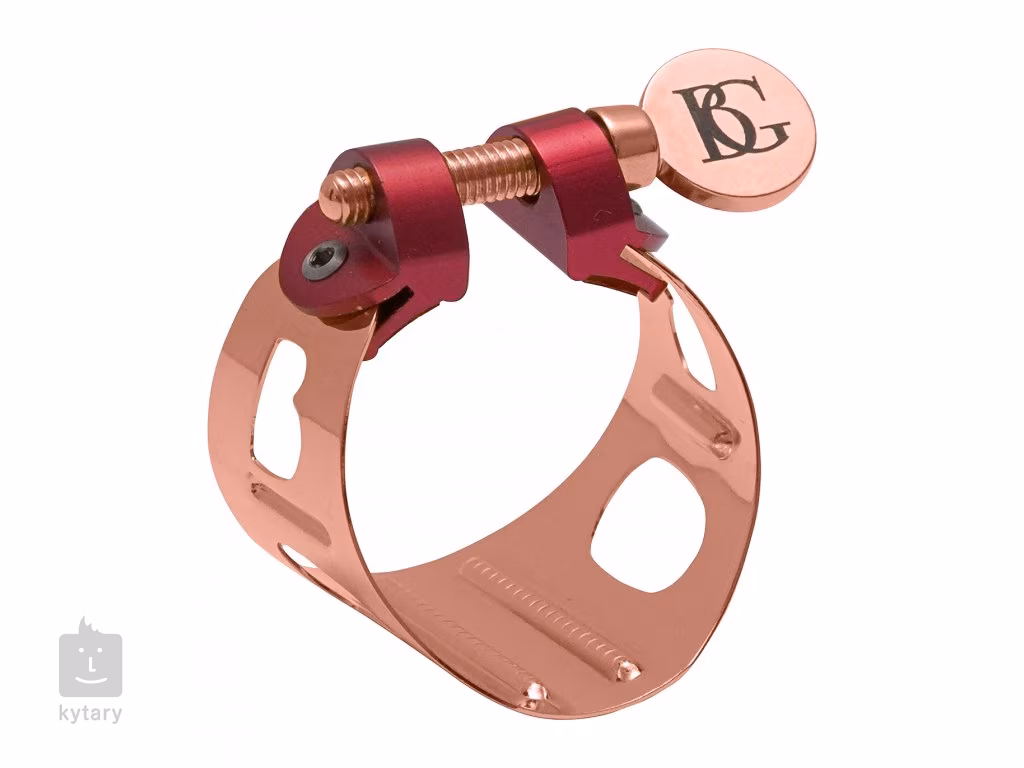 Kovová ligatúra s povrchovou úpravou Rose Gold pre náustok sopránového saxofónu.