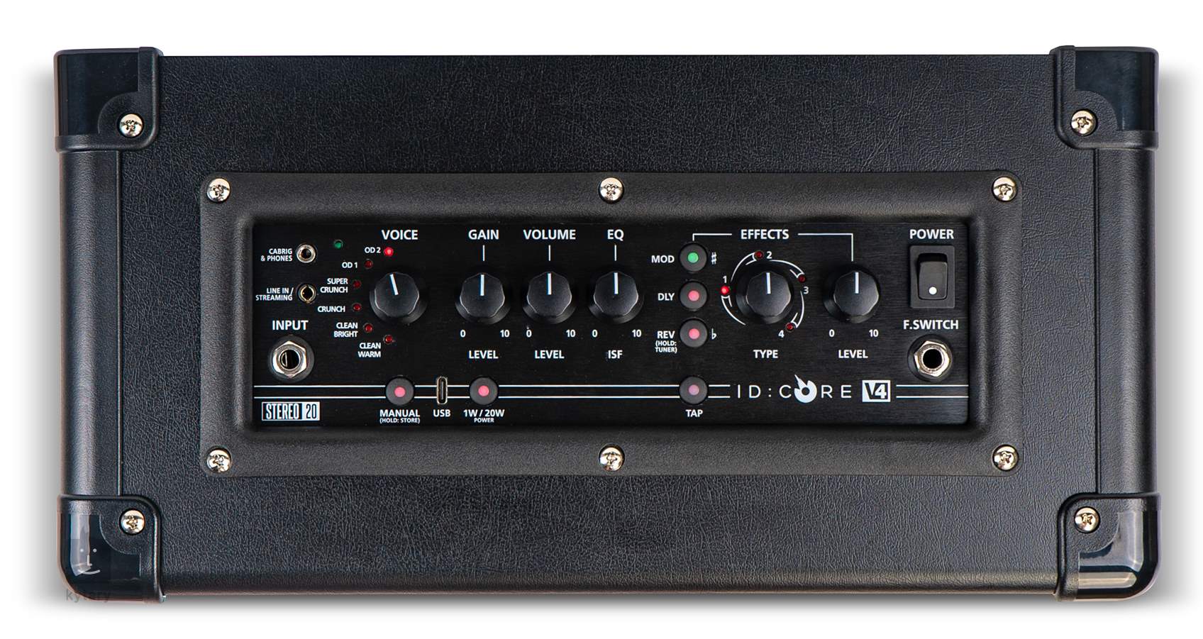 ID:Core20 V4 teraz ponúka prepínateľný výkon 1 W/20 W, takže môžete hrať pri nižších hlasitostiach bez straty kvality zvuku. Obľúbené funkcie, vrátane užívateľsky prívetivého rozhrania z predchádzajúcich modelov, zostali zachované. Opäť môžete pracovať so šiestimi kanálmi, od čistého zvuku cez rockový crunch až po high gain distortion, s ovládaním EQ ISF (nastavenia amerického alebo britského zvuku) a efektmi v štúdiovej kvalite rozdelenými do troch skupín – modulácia (phaser, chorus/flanger, envelope, tremolo), Delay (Lineárny, Analógový, Páskový, Multi), Reverb (Miestnosť, Sála, Pružina, Doska).
