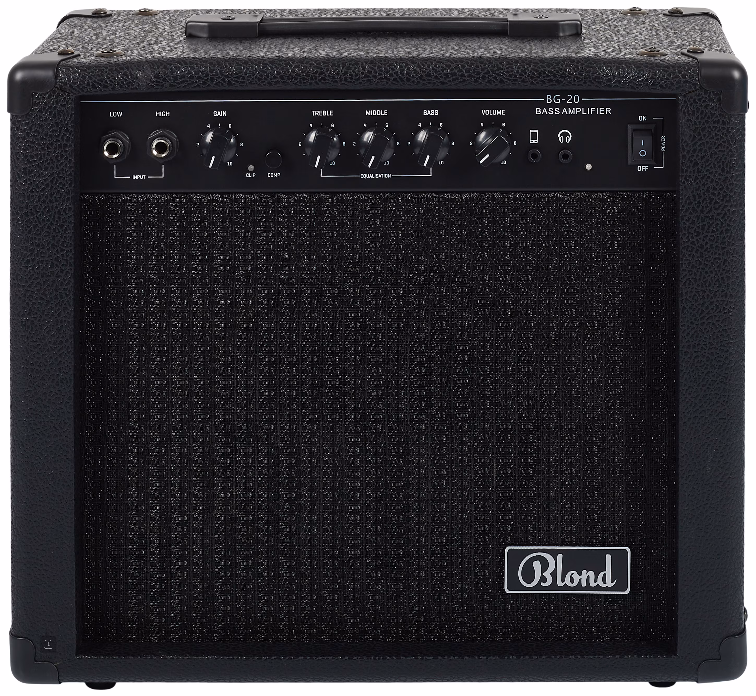 S výkonom 20 W a skvelou cenou je basgitarový tranzistorový kombo Blond BG-20 ideálnym spoločníkom pre začínajúcich basgitaristov. Je vybavený ovládaním zosilnenia predzosilňovača, ovládaním hlavnej hlasitosti, trojpásmovým ekvalizérom, vstavaným kompresorom, výstupom na slúchadlá a aux vstupom pre prehrávanie sprievodných skladieb. S 20 W osempalcovým reproduktorom sa osvedčí v skúšobni aj na vašich prvých koncertoch pre priateľov.