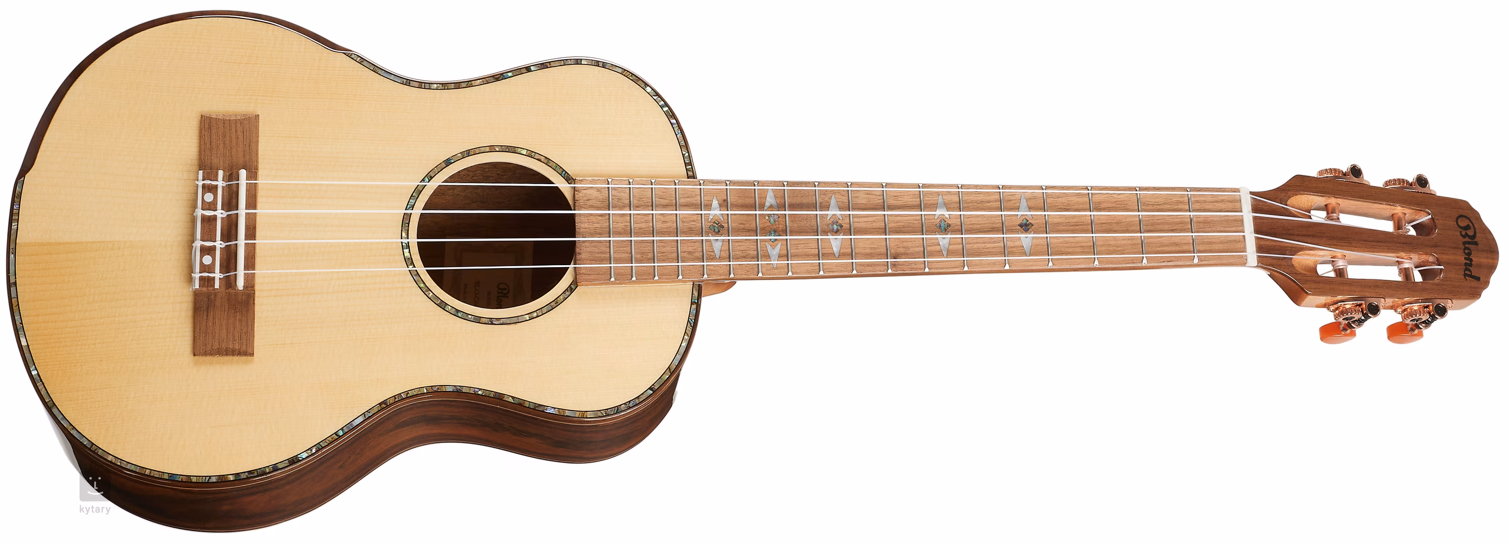 Blond BLO-G60-26 je polomasívne tenorové ukulele s vrchnou doskou zo smreka Engelmann, laminovanou zadnou doskou a lubmi z exotického dreva s výraznou kresbou a hmatníkom a kobylkou z čierneho orecha.