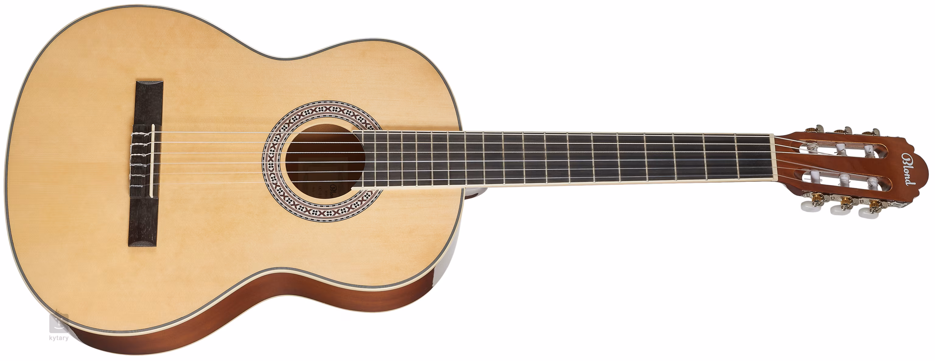 Klasická gitara Blond OC-44 NAT vo veľkosti 4/4 ponúka telo vyrobené z laminovaného smrekového a lipového dreva, krk z dreva okoumé a hmatník a hlavicu z moderného kompozitného materiálu. Struny sú uchytené v klasickej pochrómovanej mechanike s bielymi kolíkmi nad plastovým nultým pražcom. Štýlovú povrchovú úpravu zvýrazňuje nanesený lesklý lak a tradičné prvky v podobe ozdobných roziet a plastových líšt (ABS).