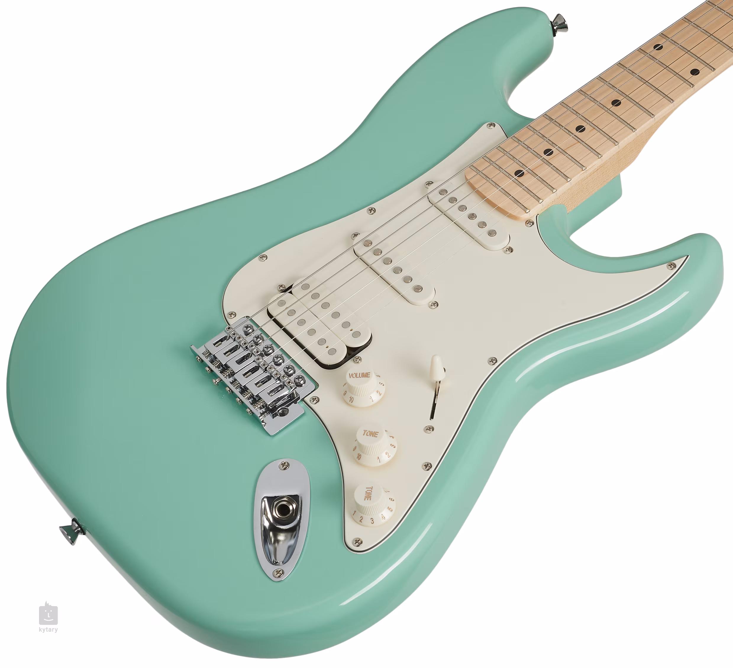 Struny držia v die-cast ladiacich mechanikách a synchronizovanom tremole. Štýlovú povrchovú úpravu podčiarkuje biely pickguard a chrómový hardvér.