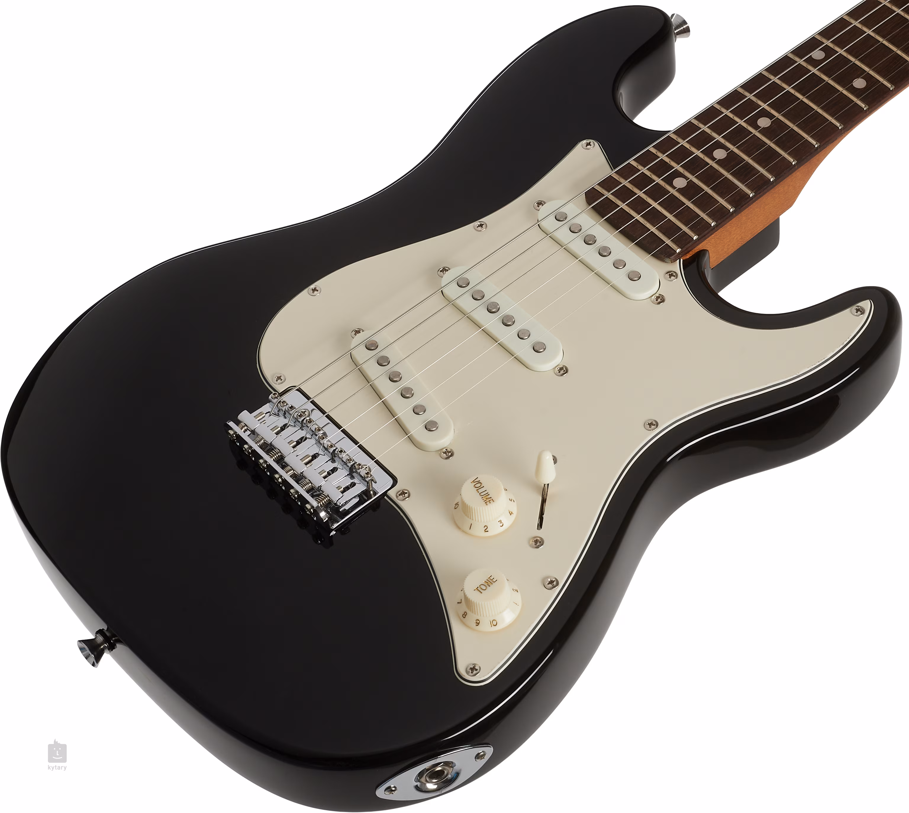 O zvuk nástroje se starají tři single-coil snímače s keramickými magnety. Barvu zvuku nastavíte podle vašich požadavků pomocí ovladačů hlasitosti a tónové clony. Struny jsou uchyceny ve firemních ladicích mechanikách ve vintage stylu a string-through kobylce, která nahrazuje tradiční tremolo ST modelů. V této cenové relaci může být pevná kobylka i výhrou. Pěkné zpracování podtrhuje stylový pickguard.