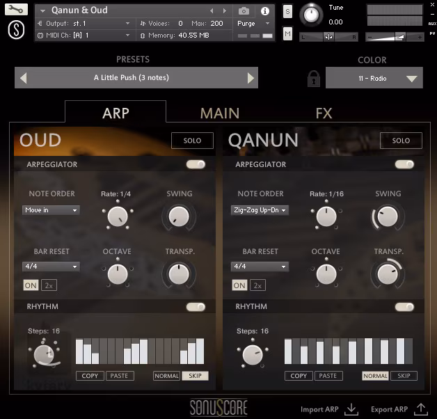 Ponořte se do středovýchodních zvuků s touto knihovnou, která spojuje Oud – tradiční nástroj arabského světa – a Qanun – zitherový nástroj známý pro svůj dramatický tón. Oba nástroje lze ovládat samostatně nebo v interakci přes Multi-Arpeggio-Designer (MAD), který umožňuje vytvářet rytmicky bohaté a emotivní zvukové plochy. Více než 90 rytmických předvoleb a 12 barevných profilů, kombinující až přes 1000 možností zvukových úprav.