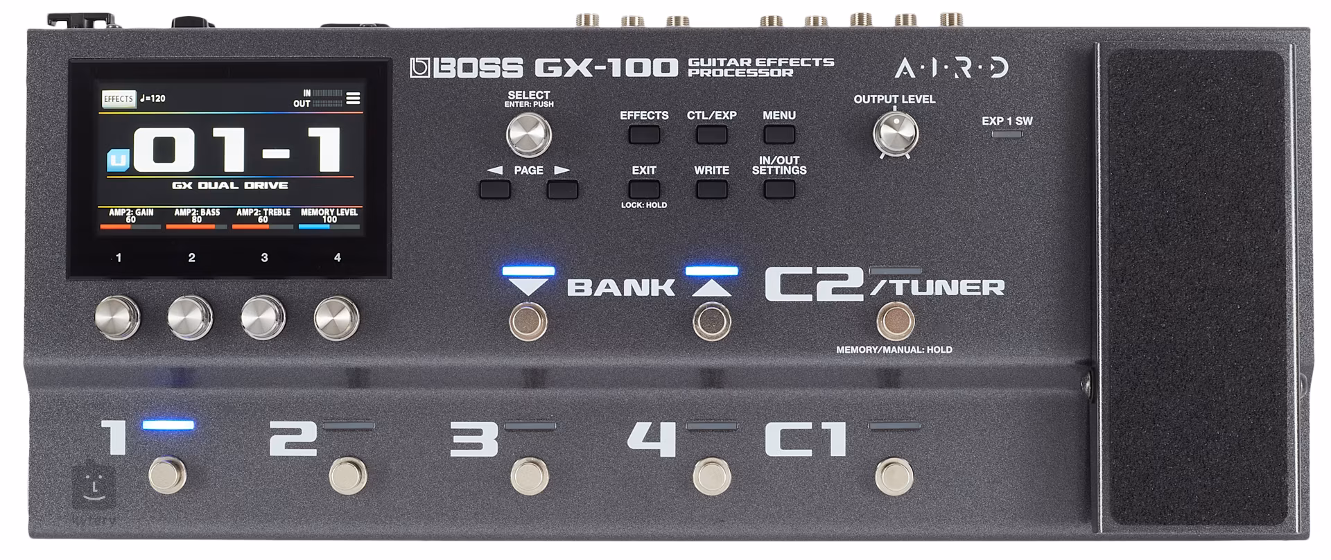 Boss GX-100 je výkonný multiefektový procesor pre gitaru alebo basgitaru s priateľským používateľským rozhraním, autentickým lampovým zvukom a dotykovou citlivosťou technológie AIRD. Ponúka 23 typov zosilňovačov a viac ako 150 efektov Boss, mimoriadne flexibilné smerovanie simulácií nástrojov/efektov s pätnástimi priraditeľnými blokmi, široký výber reproboxov a podporu nahrávania IR kabinetov vo formáte WAV, moderný dizajn s intuitívnym farebným dotykovým displejom a robustným kovovým šasi a takmer neobmedzené možnosti ovládania s priraditeľnými nožnými spínačmi, expression pedálom plus dvoma ďalšími externými spínačmi, externým expression pedálom alebo MIDI zariadeniami, ktoré možno integrovať s multiefektami.