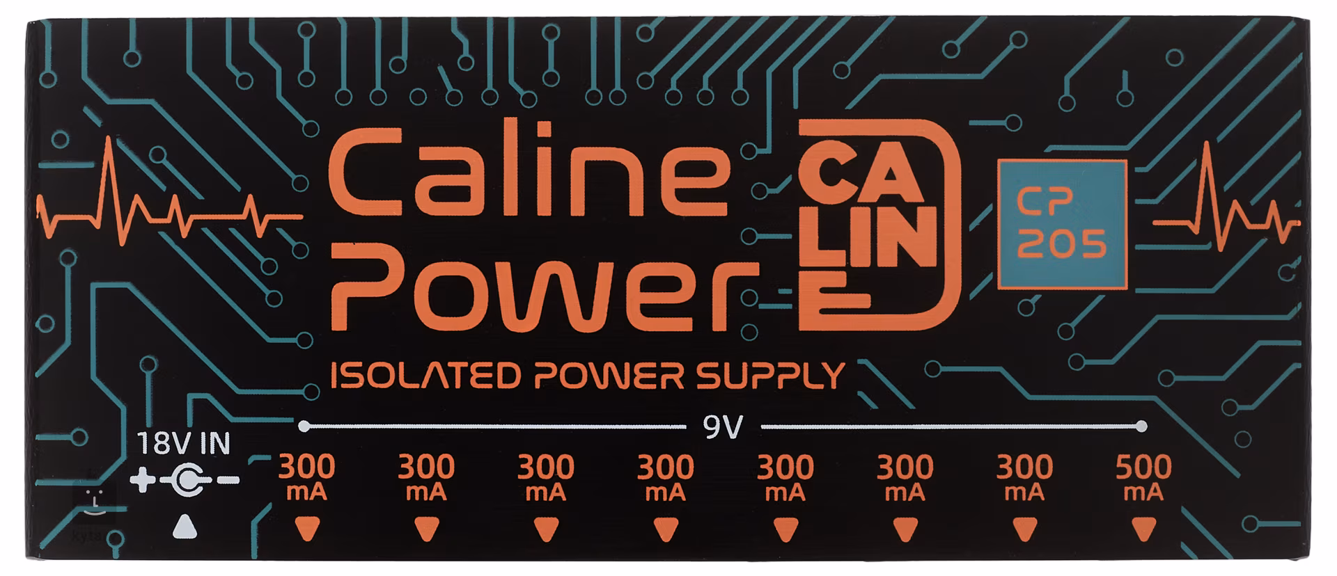CP-205 je čínsky multiadaptér Caline, ktorý ponúka osem 9V DC výstupov na napájanie pedálových efektov - sedem z nich má maximálny odber 300 mA a jeden zvládne až 500 mA. Súčasťou balenia je napájací adaptér, príslušný počet prepojovacích káblov a redukcie pre iné typy konektorov.