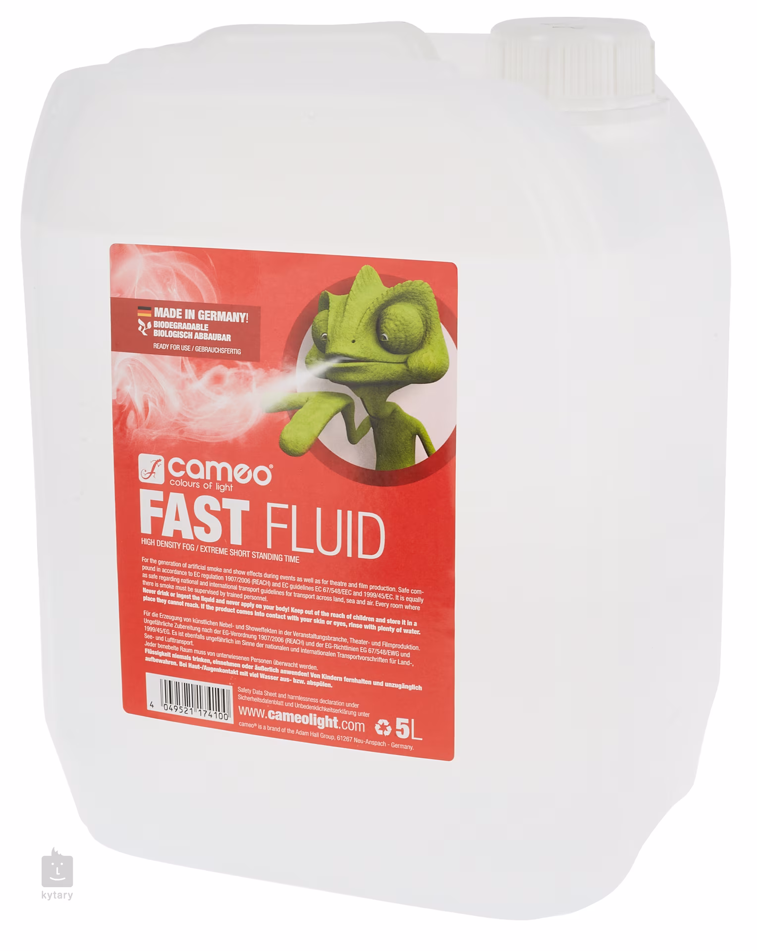 Fast Fluid 5 l od spoločnosti Cameo je špeciálna hmlovacia kazeta, ktorá vytvára vysoko kvalitný efekt CO2 - veľmi hustú hmlu s mimoriadne krátkym časom rozptýlenia (do niekoľkých sekúnd). Kartuša je vhodná pre väčšinu bežných hmlovacích zariadení. Voda použitá na výrobu kartuše bola 10-krát destilovaná, čo zaručuje, že sa vo výrobníku neusadzujú žiadne zvyšky kartuše, čím sa niekoľkonásobne predlžuje životnosť vášho zariadenia. Náplň je netoxická, ľahko biologicky odbúrateľná a je zdravotne nezávadná a neškodná pre životné prostredie.