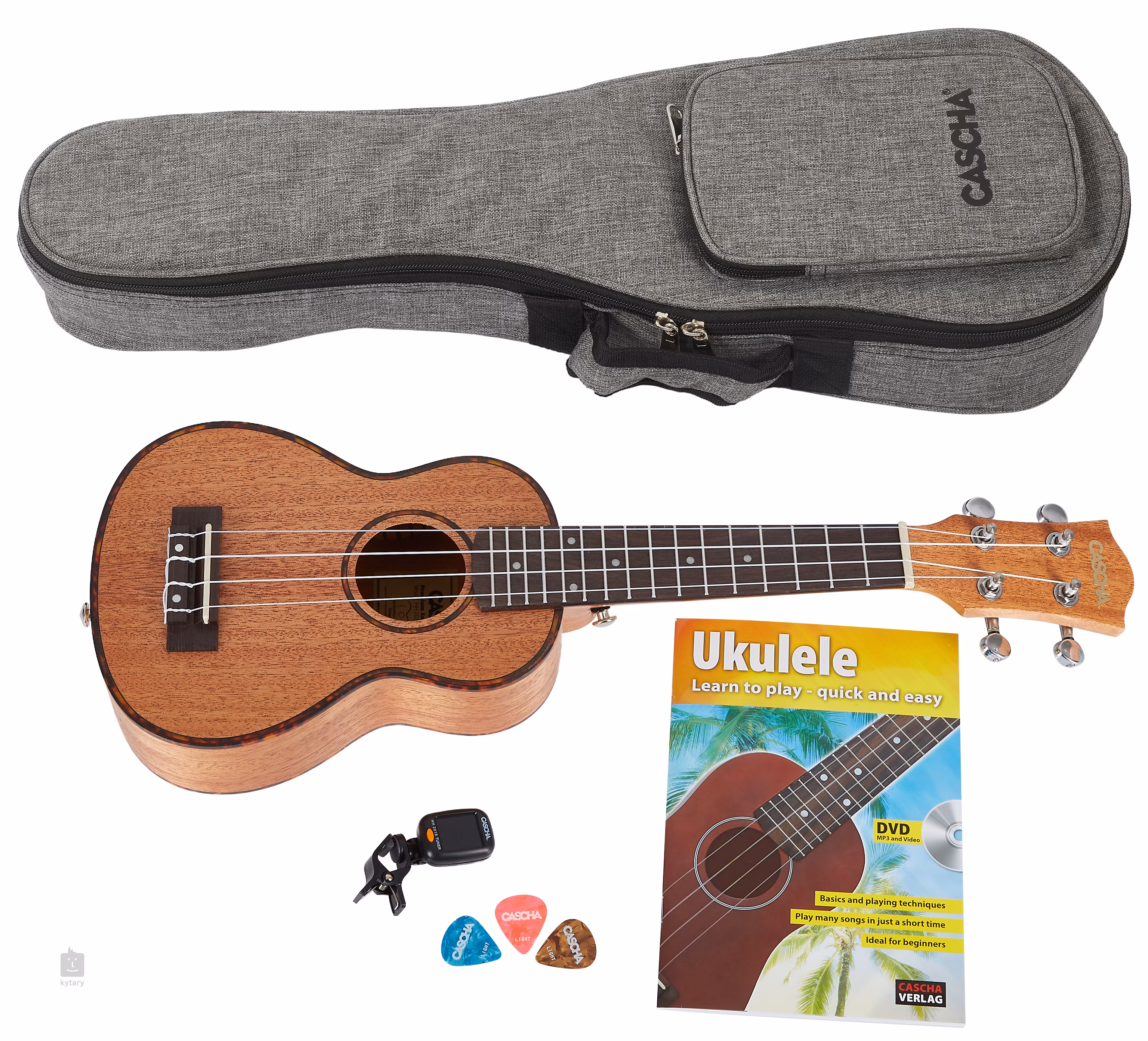 Sopránové ukulele Cascha Premium je cenovo dostupný nástroj, ktorý poteší deti aj dospelých. V rámci tohto štartovacieho balíka dostanete praktické polstrované puzdro (hrúbka polstrovania 5 mm), tri trsátka, školu hry na ukulele v anglickom jazyku so sprievodným DVD a klipovú ladičku (na napájanie ladičky je potrebná lítiová batéria CR2032).