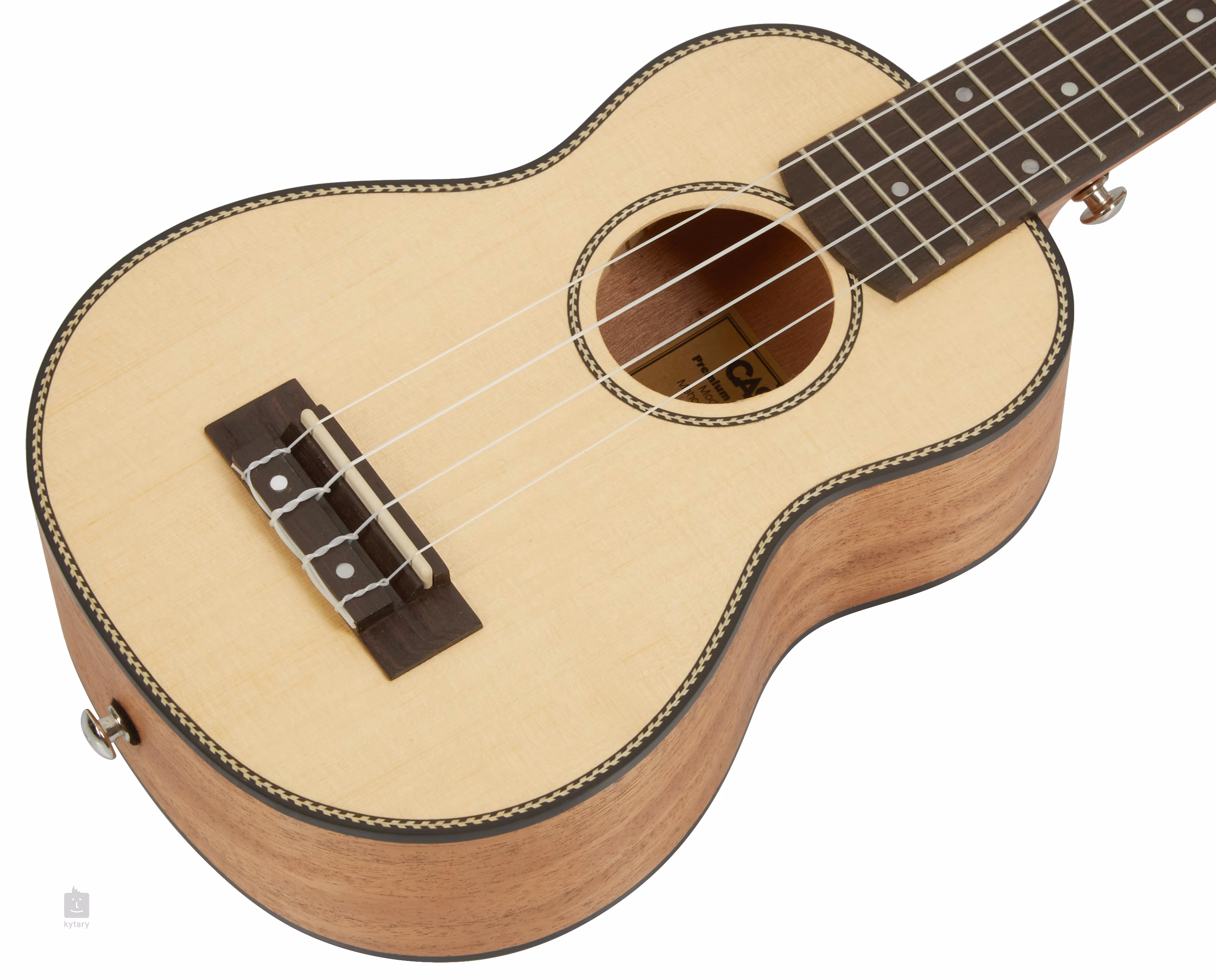 Struny sú uchytené v pochrómovaných mechanikách gitarového typu a palisandrovom hmatníku. Pekné spracovanie podčiarkuje rozeta a pickguard so vzorom rybej kosti a čierne obojstranné obvodové lemovanie tela. Ukulele sa dodáva v polstrovanom puzdre (hrúbka polstrovania 5 mm) s tromi trsátkami.