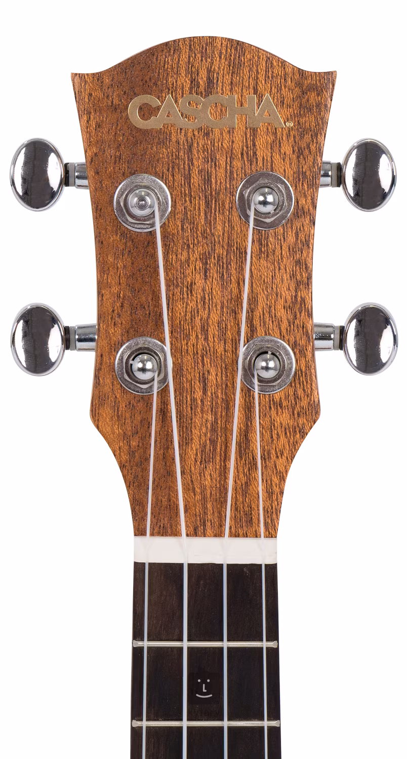 Predná doska tenorového ukulele Cascha Premium Series - Solid Top je vyrobená z masívneho smrekového dreva, zatiaľ čo zadná doska a luby sú z laminovaného mahagónu. Palisandrový hmatník je rozdelený devätnástimi pražcami. Polohové bodky uľahčujú orientáciu na hmatníku. Struny sú uchytené v pochrómovaných gitarových mechanikách a palisandrovom hmatníku. Pekné spracovanie podčiarkuje rozeta a pickguard so vzorom rybej kosti a čierne obojstranné obvodové lemovanie tela.