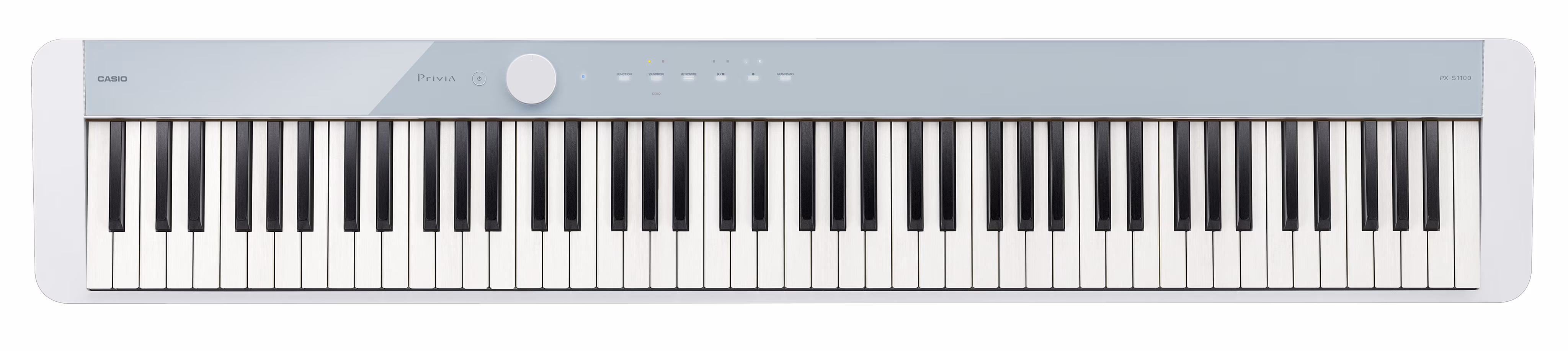Casio PX-S1100 je elegantní digitální piano, které spojuje minimalistický design, špičkovou technologii a autentický zážitek ze hry na akustický klavír. Se svou hloubkou pouhých 232 mm patří mezi nejtenčí digitální piana s kladívkovou mechanikou a 88 klávesami na světě, takže se snadno vejde do každého interiéru – od obývacího pokoje až po ložnici.