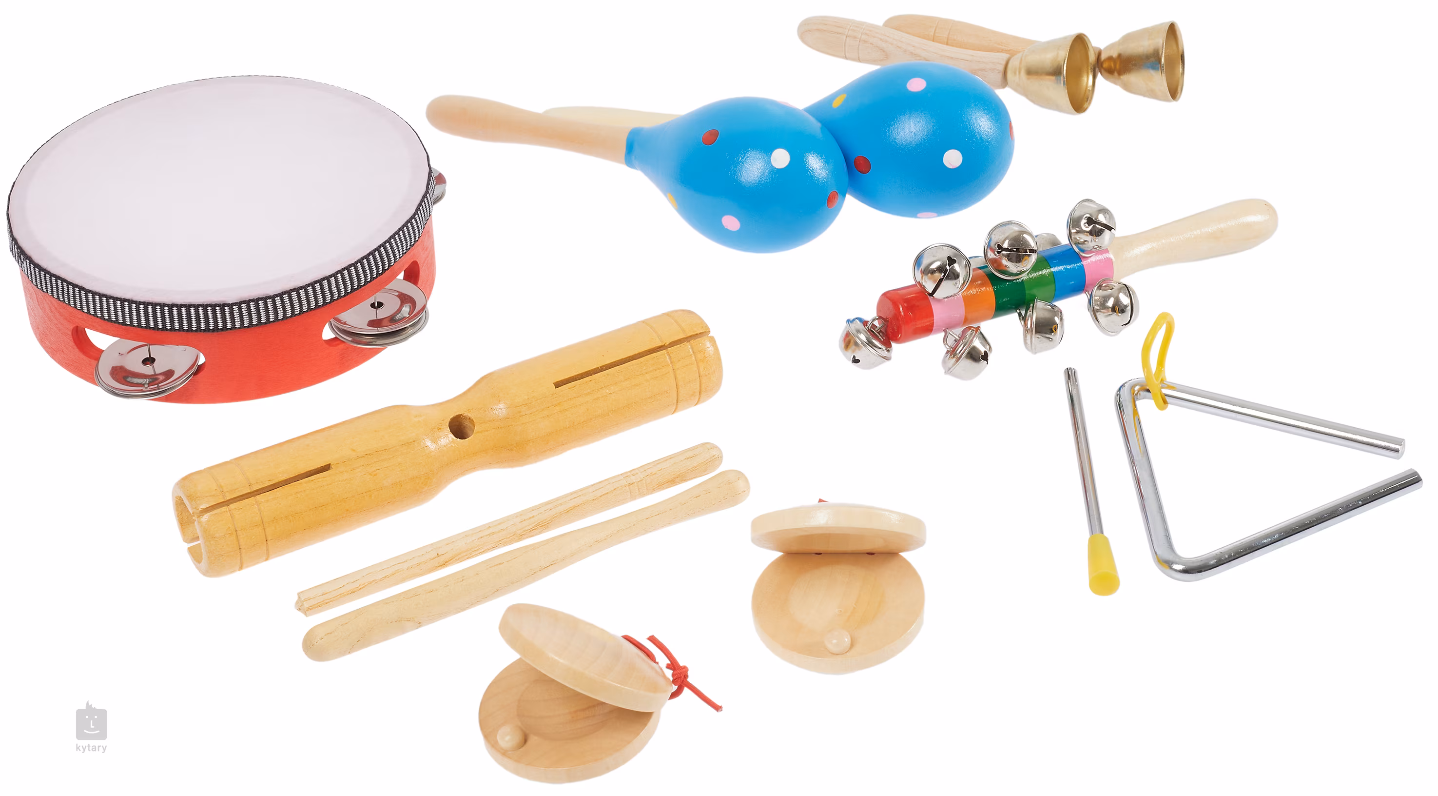 Všetky nástroje v súprave sú vyrobené z vysokokvalitných materiálov, ktoré zaručujú odolnosť, bezpečné používanie a príjemný zvuk. Súprava obsahuje triangel, dve kastanety, rezonančné drevo s dvoma paličkami, dve rumbakule, tamburínu, dva zvončeky a gong.
