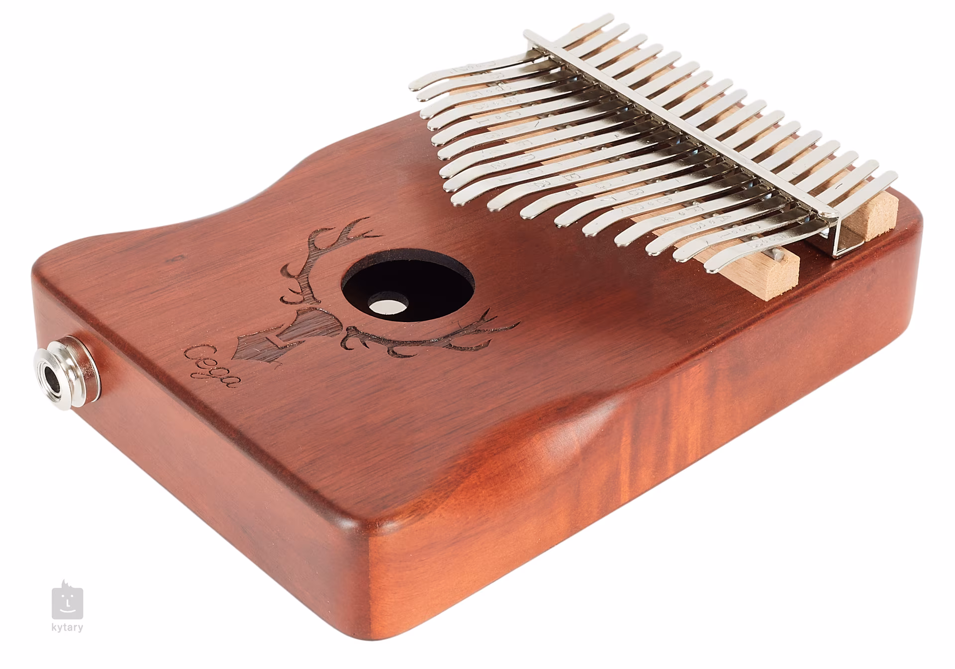 Kalimba je jedinečný melodický nástroj, ktorý dodá vašej produkcii alebo živému vystúpeniu jedinečný a nezameniteľný prvok. Možno ju použiť na sprievod alebo sólovú hru. Kalimby od spoločnosti Cega sú vyrobené z vysokokvalitných drevín, ktoré sa sušia len prirodzeným spôsobom, čo im dodáva skvelé zvukové vlastnosti a maximálnu stabilitu. Tento model je vyrobený z mahagónu a zdobený laserom vypaľovaným vzorom. Klávesy z uhlíkovej ocele potom dodávajú nástroju jasný a hlasný, no stále príjemne teplý zvuk, ktorý je v tomto modeli ešte umocnený vďaka ozvučnému otvoru. Klávesy sú tiež vybavené vygravírovanými notami, ktoré pomôžu zorientovať sa najmä novým hráčom. Na spodnej strane nájdete rolničku slúžiacu na pripevnenie popruhu, ale hlavne aj ako vstup pre 6,3 mm jack konektor na pripojenie k PA systému alebo kombu. To rozširuje možnosti využitia tohto nástroja napríklad aj na pódiách.
