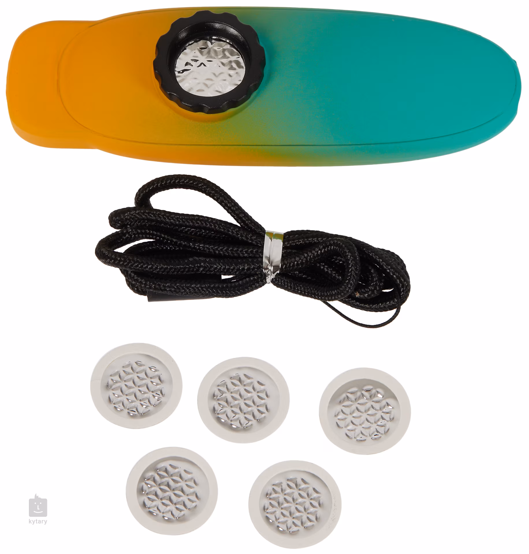 Klasické plastové kazoo. Otáčaním krytu môžete nastaviť napätie membrány a zmeniť zvukovú odozvu kazoo.