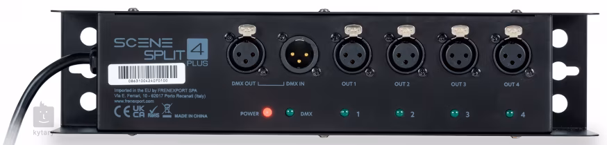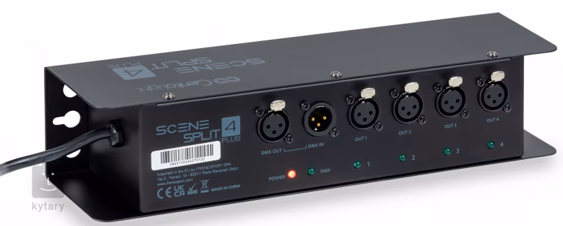 Scenesplit 4 Plus od společnosti CentoLight je čtyřkanálový DMX distributor, který vám umožní rozdělit DMX signál do 4 separátních výstupů. Můžete ho využít jako stolní zařízení nebo jej namontovat na pódiovou konstrukci. Jeho bytelné šasi a kvalita použitých komponentů zajišťují spolehlivý provoz i v těch nejnáročnějších podmínkách. Distributor disponuje 3pinovými opticky izolovanými XLR konektory – vstupem DMX in, výstupem DMX out a čtyřmi výstupy pro rozdělení signálu. Každý z kanálů je vybaven LED kontrolkou pro indikaci přítomnosti DMX signálu.