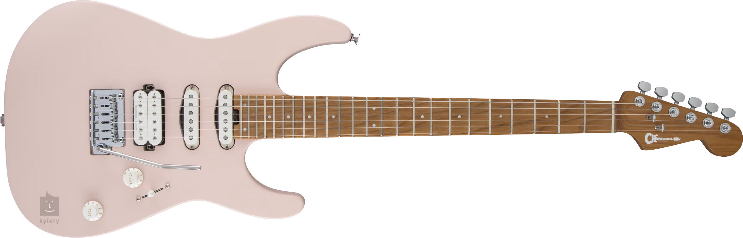 Elektrická gitara Charvel Pro-Mod DK24 HSS 2PT CM Satin Shell Pink má telo typu Dinky/Superstrat.