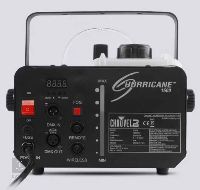 Kompaktný výrobník hmly ChauvetHurricane 1600 je ideálnou voľbou pre mobilných umelcov, nočné kluby, stredne veľké pódiá, strašidelné uličky v zábavných parkoch a mnohé ďalšie situácie. Ponúka vysoký výkon 708 m³ za minútu a objem nádrže 2,4 litra. Prvotné zahriatie na prevádzkovú teplotu trvá približne 4 minúty, potom je výrobca vždy pripravený na akciu.