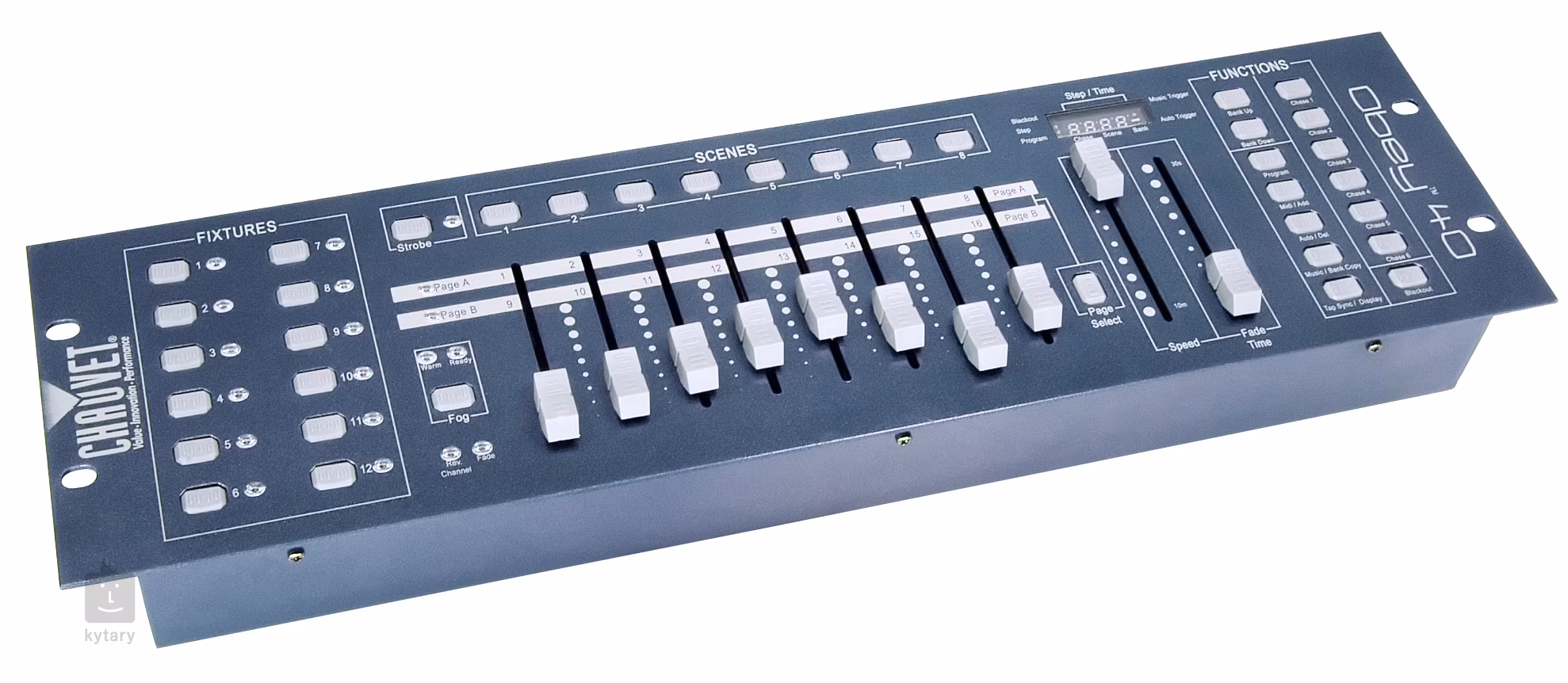 Obey 40 od spoločnosti Chauvet DJ je profesionálny DMX kontrolér, ktorý ponúka zlatú strednú cestu medzi rozsiahlymi možnosťami ovládania a kompaktnými rozmermi. Ide o 19" rackový kontrolér, ktorý zaberá celkom tri jednotky (3U). Zariadenie umožňuje ovládať 12 svietidiel a ovládať až 16 kanálov pre každé svietidlo. Celkovo zvládne 192 kanálov. Okrem toho umožňuje naprogramovať až 240 scén a vytvárať z nich sekvencie alebo chases. K dispozícii je 8 pamäťových bánk pre scény (každá pojme 30 scén) a 6 sekvencií (každá sekvencia môže obsahovať až 240 krokov).