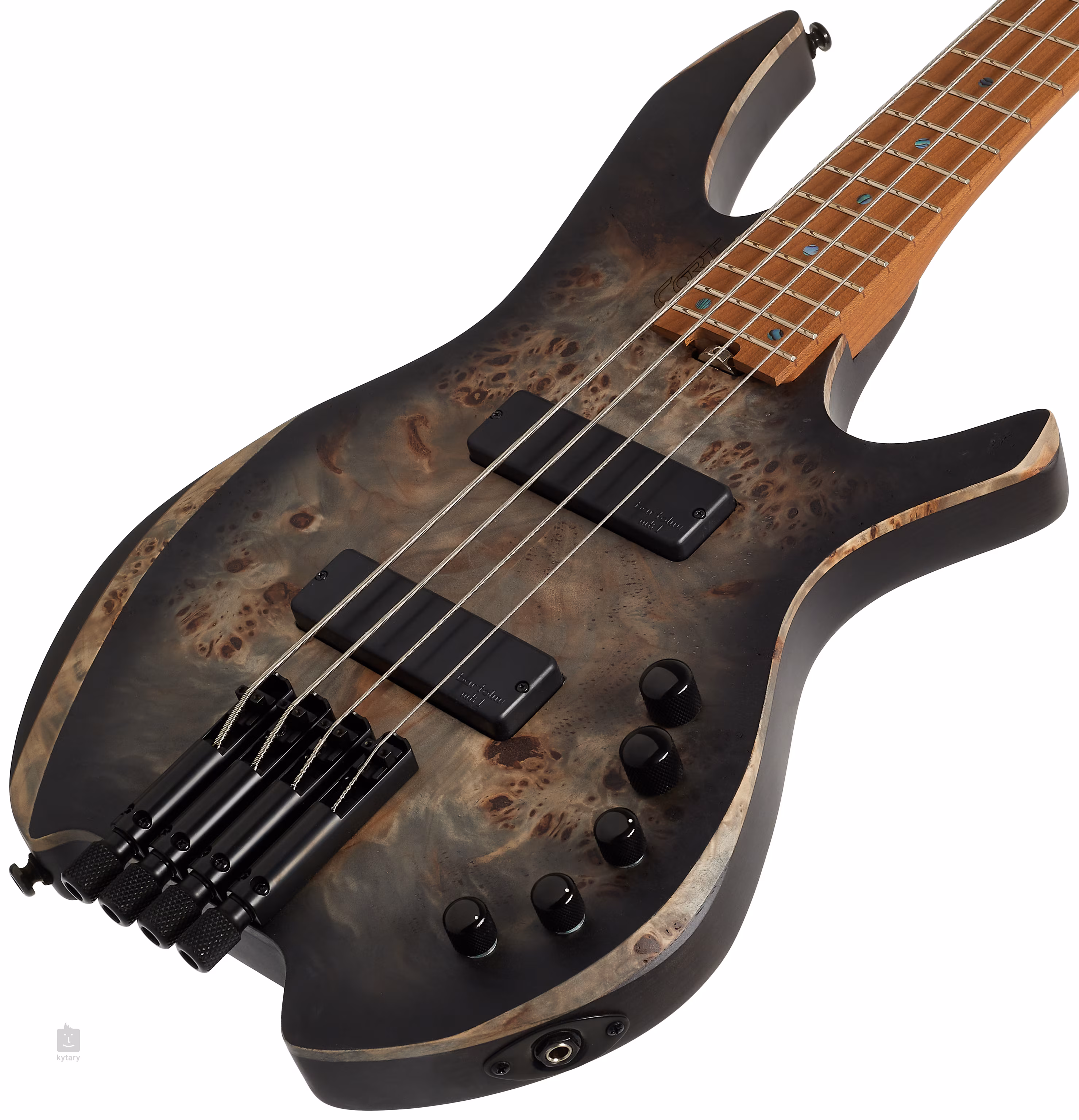 Javorové tělo baskytary zdobí top z kořenice topolu (poplar burl) a matná barevná úprava Star Dust Black. K rychlému pohodlnému krku ze sedmi kusů javoru, ořechu a dřeva purpleheart je přilepen hmatník z pečeného javou osazený čtyřiadvaceti pražci z pakfongu (nickel silver) velikosti Medium Jumbo. Krk povolíte nebo dotáhnete pomocí snadno přístupné dvoucestné výztuhy. Orientaci na hmatníku usnadňují perleťové polohové tečky (abalone).