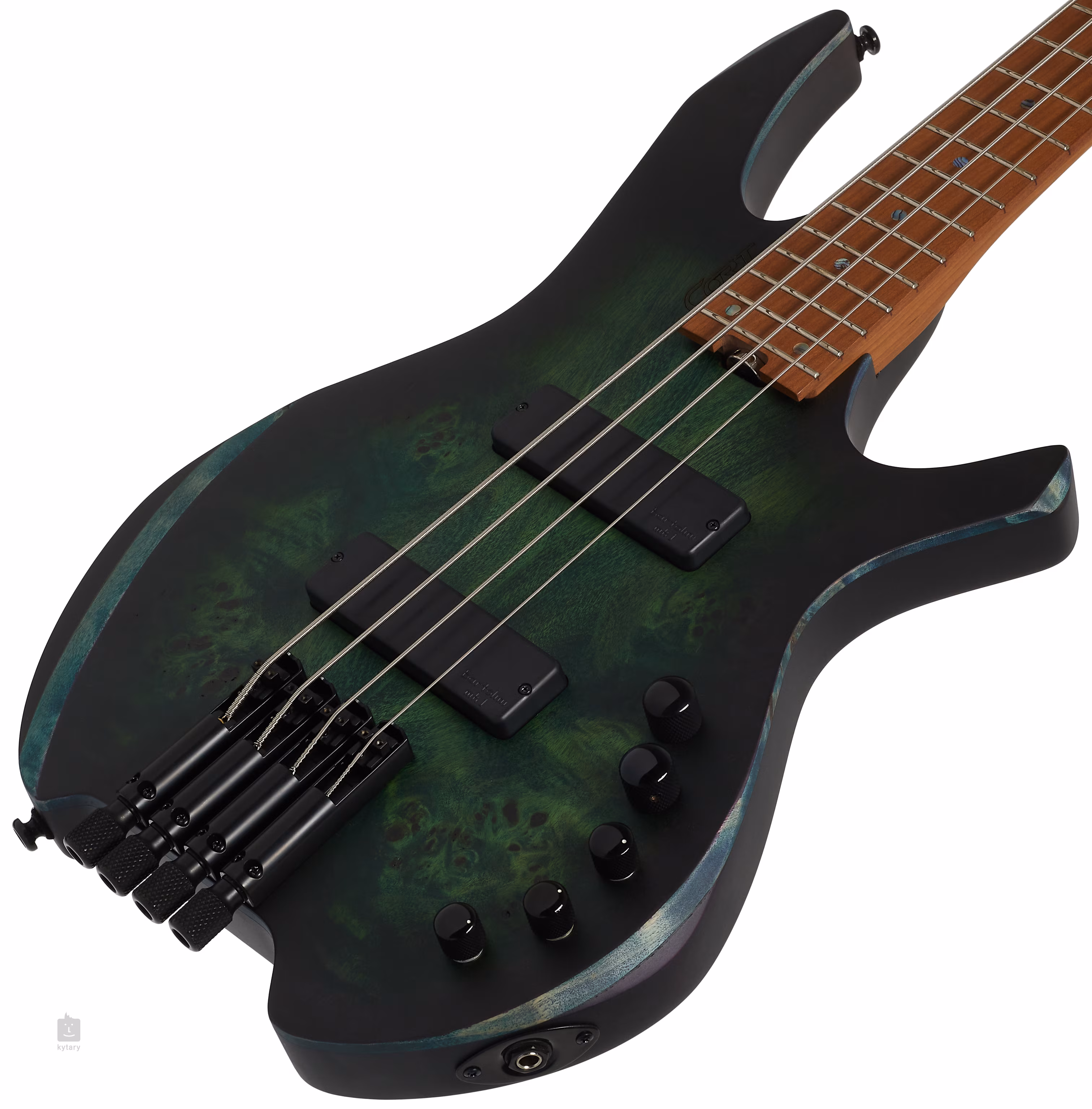Javorové tělo baskytary zdobí top z kořenice topolu (poplar burl) a matná barevná úprava Star Dust Green. K rychlému pohodlnému krku ze sedmi kusů javoru, ořechu a dřeva purpleheart je přilepen hmatník z pečeného javou osazený čtyřiadvaceti pražci z pakfongu (nickel silver) velikosti Medium Jumbo. Krk povolíte nebo dotáhnete pomocí snadno přístupné dvoucestné výztuhy. Orientaci na hmatníku usnadňují perleťové polohové tečky (abalone).