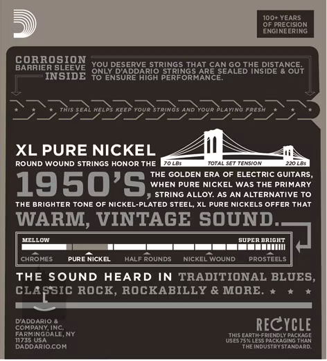 Struny D'Addario XL Pure Nickel pre elektrickú gitaru vás vrátia do 50. rokov 20. storočia, keď boli struny z čistého niklu zlatým štandardom. Majú šesťhranné oceľové jadro, ktoré zaisťuje perfektnú intonáciu, dlhú životnosť a konzistentnú hrateľnosť. Opletené struny sú potiahnuté čistým niklovým drôtom, ktorý produkuje bohatý, ale jasný zvuk, ktorý možno spoznáte z raných bluesových, rock 'n' rollových a country nahrávok alebo z rockovej éry 50. a 60. rokov. Ideálne pre všetkých milovníkov vintage tónov.
