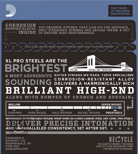 Struny D'addario XL ProSteels pre elektrickú gitaru ponúkajú výnimočne jasný a prenikavý zvuk, ktorý vynikne v každom mixe. Sú vyrobené z unikátnej, vysoko magnetickej zliatiny ocele, ktorá produkuje jasný, ostrý tón s dlhým sustainom. Sú založené na šesťhrannom oceľovom jadre, ktoré zaisťuje perfektnú intonáciu, dlhú životnosť a konzistentný pocit. Ovinuté struny sú potiahnuté drôtom z nehrdzavejúcej ocele, ktorý perfektne spolupracuje s magnetickými snímačmi a poskytuje neuveriteľne prenikavý tón. Ideálne pre koncerty a použitie v štúdiu.